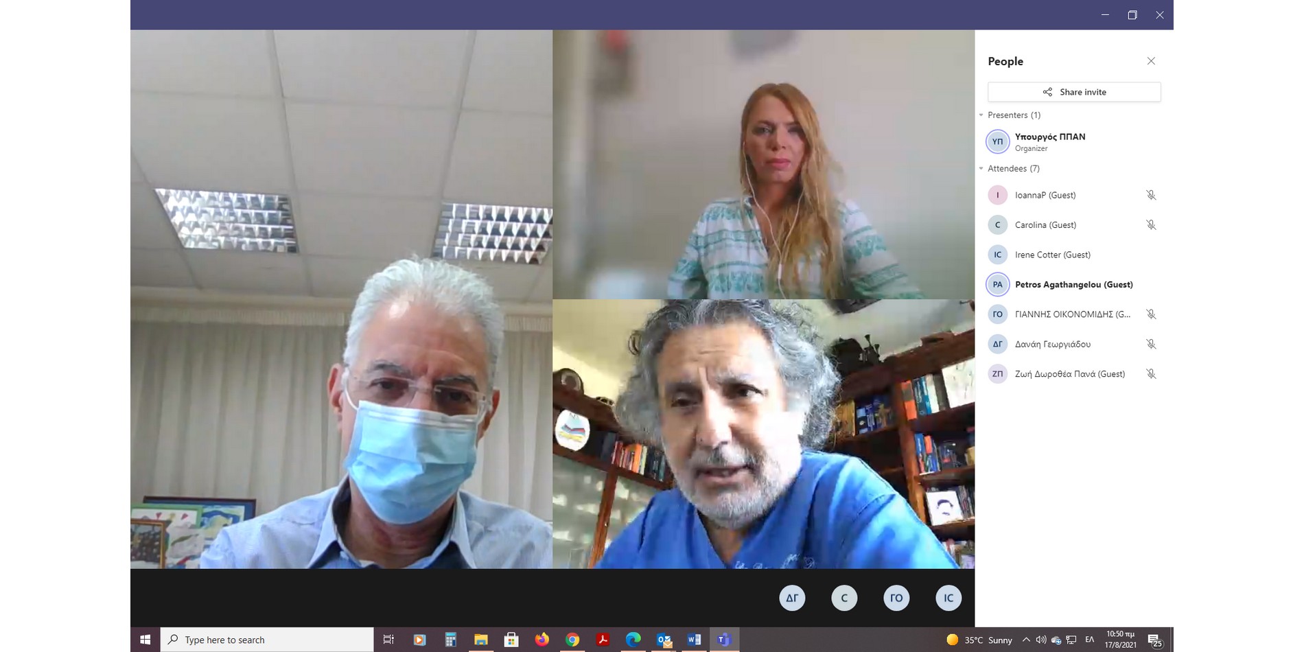 Συγκεκριμένα, στη τηλεδιάσκεψη από την πλευρά των ειδικών συμμετείχαν οι δρες Κωνσταντίνος Τσιούτης και Ζωή-Δωροθέα Πανά, που συμμετέχουν επίσης στη Συμβουλευτική Επιστημονική Επιτροπή του Υπουργείου Υγείας, ο Πρόεδρος του Παγκύπριου Ιατρικού Συλλόγου, δρ Πέτρος Αγαθαγγέλου, ο Γραμματέας της Παιδιατρικής Εταιρείας, δρ Μιχάλης Αναστασιάδης, η Ανώτερη Ιατρική Λειτουργός στη Σχολιατρική Υπηρεσία, τις Ιατρικές Υπηρεσίες και τις Υπηρεσίες Δημόσιας Υγείας του Υπουργείου Υγείας, δρ Ειρήνη Κόττερ και η Συντονίστρια του Προγράμματος Πληθυσμιακού Ελέγχου του Υπουργείου Υγείας κα Καρολίνα Στυλιανού. Από πλευράς Υπουργείου συμμετείχαν ο Γενικός Διευθυντής κ. Κύπρος Κυπριανού και ο Προϊστάμενος του Γραφείου Πολιτικής Άμυνας, Ασφάλειας και Υγείας, δρ Ηλίας Μαρκάτζης.
