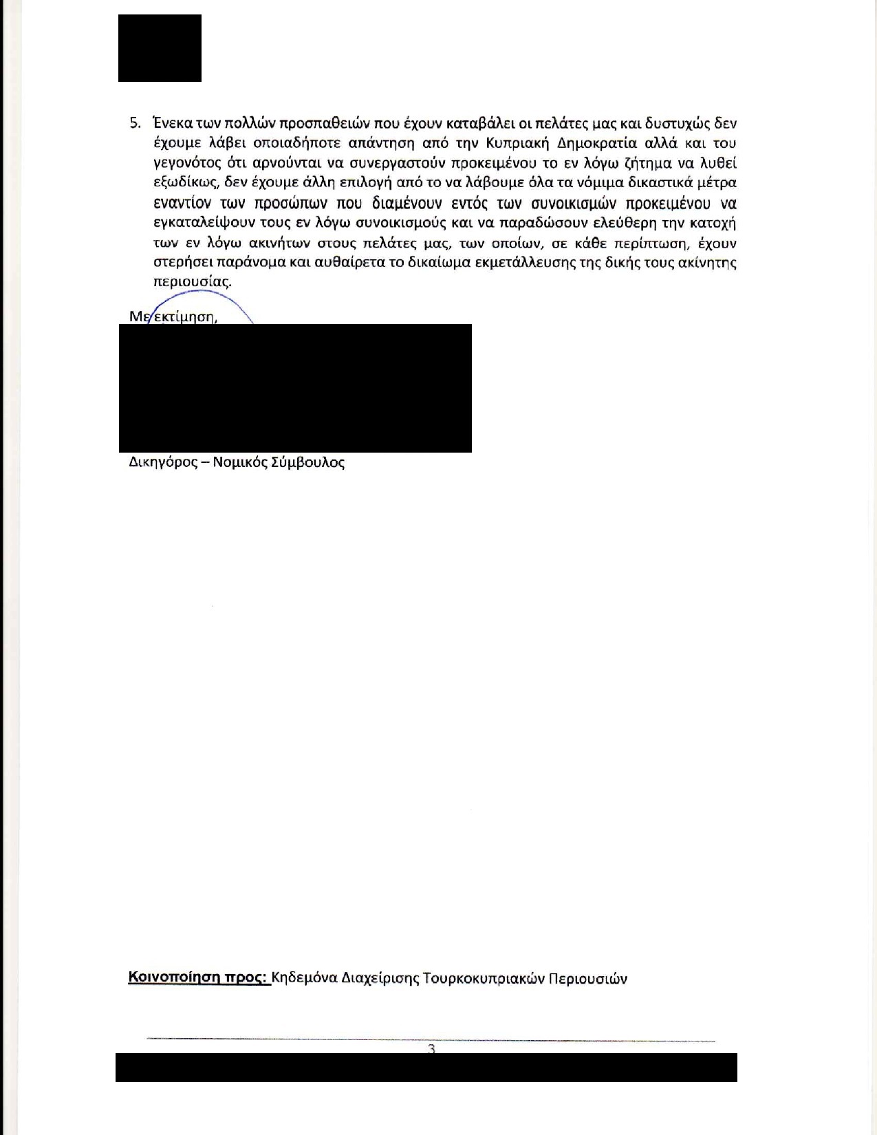 Σε επιστολή που απέστειλε ο δικηγόρος-διαχειριστής της περιουσίας στον Πρόεδρο της Κοινοβουλευτικής Επιτροπής Προσφύγων, στον Δήμαρχο Ιεροκηπίας και στον Αντιδήμαρχο Τίμης, ισχυρίζεται ότι τα τελευταία δεκατρία χρόνια έχει καταβάλει εντατικές προσπάθειες για εξωδικαστικό συμβιβασμό χωρίς αποτέλεσμα, ενημερώνοντας σχετικά τους πρώην Προέδρους της Δημοκρατίας και τους διατελέσαντες Υπουργούς Εσωτερικών.