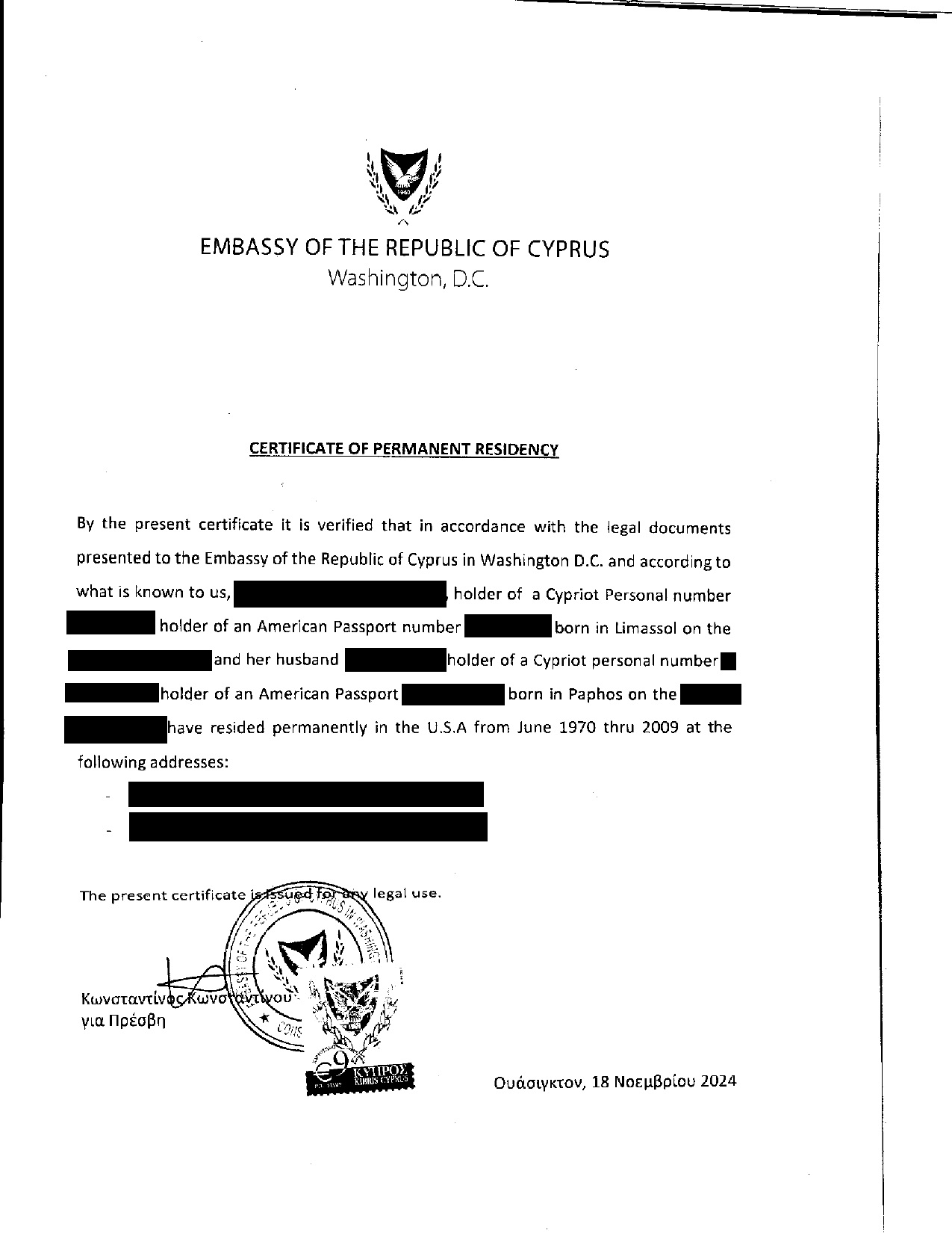 Ο Τουρκοκύπριος ιδιοκτήτης διαμένει στις Ηνωμένες Πολιτείες Αμερικής και έχει εξασφαλίσει σχετικά πιστοποιητικά από την Πρεσβεία της Κυπριακής Δημοκρατίας στην Ουάσιγκτον, ότι είχε αναχωρήσει από την Κύπρο πριν από το 1974.