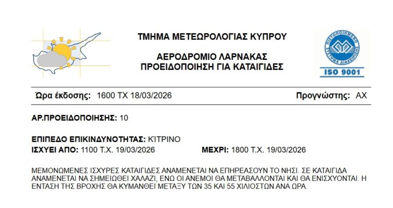 Κατά διαστήματα αναμένονται μεμονωμένες ισχυρές καταιγίδες, γι’ αυτό και το Τμήμα Μετεωρολογίας έχει εκδώσει προειδοποίηση για καταιγίδες με ισχύ από αύριο Πέμπτη στις 11 το πρωί μέχρι τις 18:00 το απόγευμα.