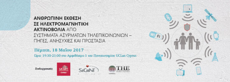 Το Πανεπιστήμιο UCLan Cyprus, σας προσκαλεί την Πέμπτη 18 Μαΐου 2017 και ώρα 19:00, στις εγκαταστάσεις του στην Λάρνακα, σε σεμινάριο ενημέρωσης με θέμα την Ηλεκτρομαγνητική Ακτινοβολία από συστήματα ασύρματων τηλεπικοινωνιών, συμπεριλαμβανομένων των κεραίων κινητής τηλεφωνίας.