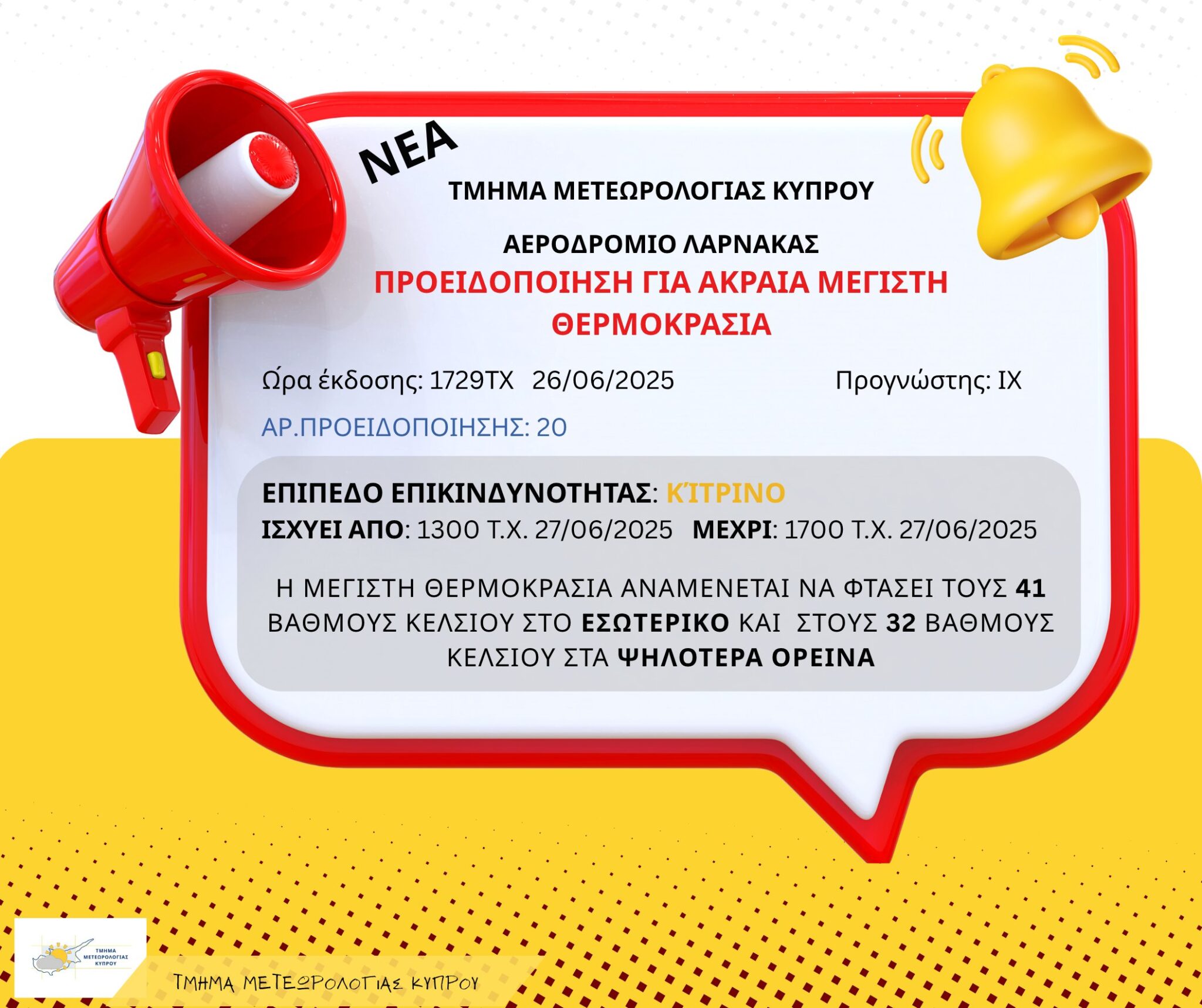 Εποχική χαμηλή πίεση και θερμή αέρια μάζα επηρεάζουν την περιοχή. Τους 41 βαθμούς Κελσίου αγγίζει σήμερα η θερμοκρασία, με Κίτρινη Προειδοποίηση να τίθεται σε ισχύ από τη μία το μεσημέρι, μέχρι και τις 17:00 το απόγευμα.