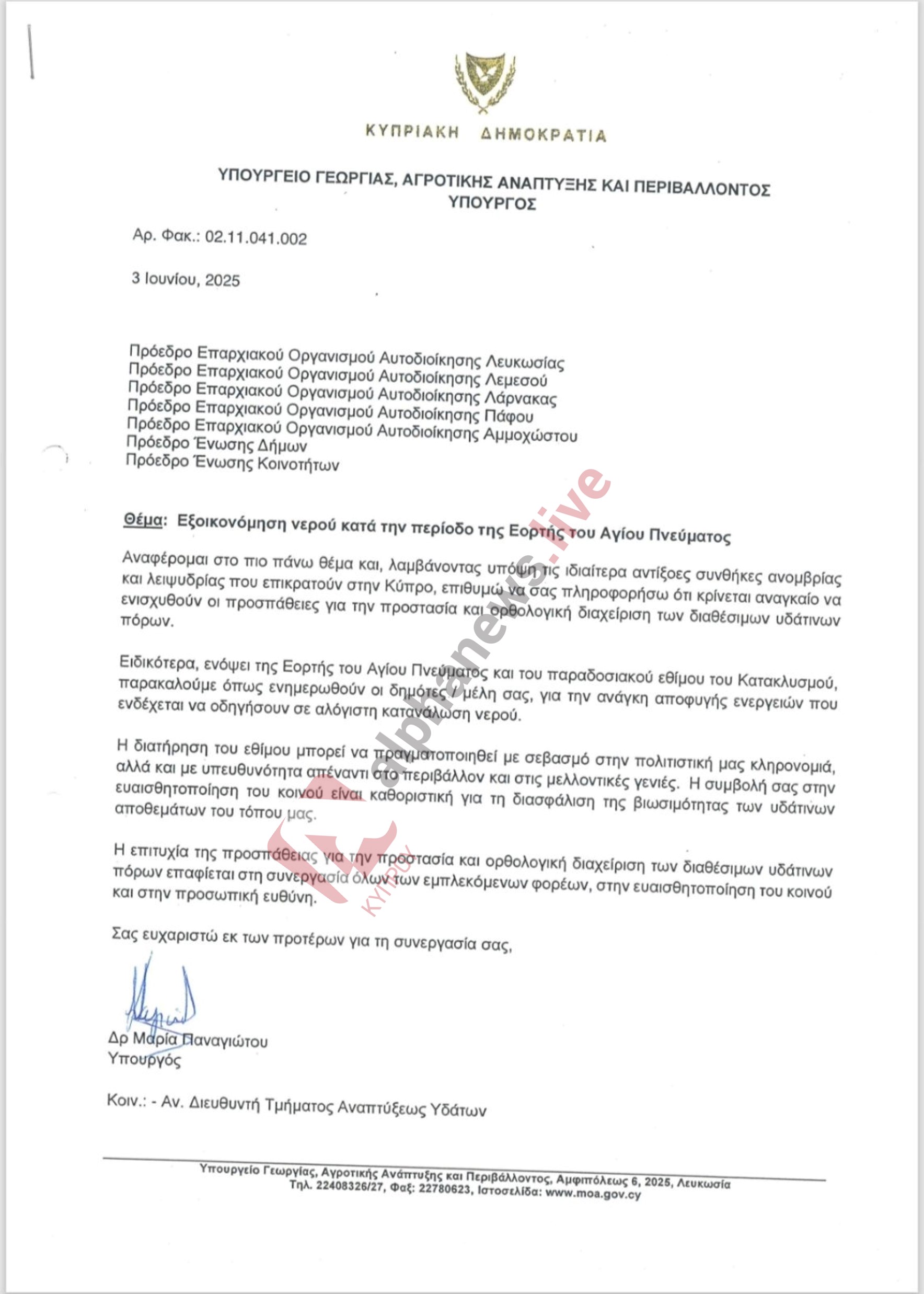 Το AlphaNews.Live εξασφάλισε τις επιστολές της Υπουργού Γεωργίας Μαρίας Παναγιώτου, με τις οποίες απευθύνεται στην Υπουργό Παιδείας αλλά και στις τοπικές αρχές, τους ΕΟΑ, την Ένωση Δήμων και την Ένωση Κοινοτήτων, καλώντας τους να ενημερώσουν τους μαθητές και τους κατοίκους, αντίστοιχα και να διασφαλίσουν ότι δεν θα σημειωθεί αλόγιστη κατανάλωση νερού ενόψει του Κατακλυσμού.