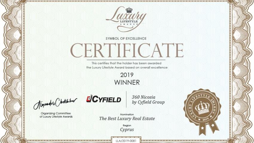 Μέσα από μια αυστηρή αξιολόγηση και διεξοδική έρευνα , το έργο του Ομίλου Cyfield, “360” Nicosia, βρέθηκε στην κορυφή της λίστας των Luxury Lifestyle Awards 2019. Το έργο είναι ο νικητής  στην κατηγορία του καλύτερου πολυτελή κτηρίου στην Κύπρο (The Best Luxury Real Estate in Cyprus).