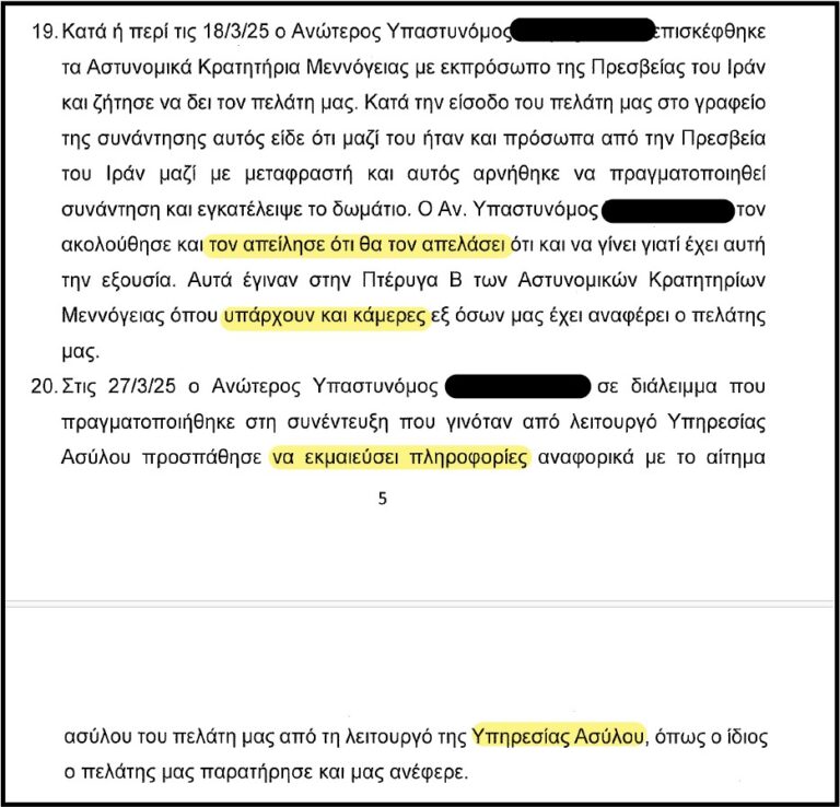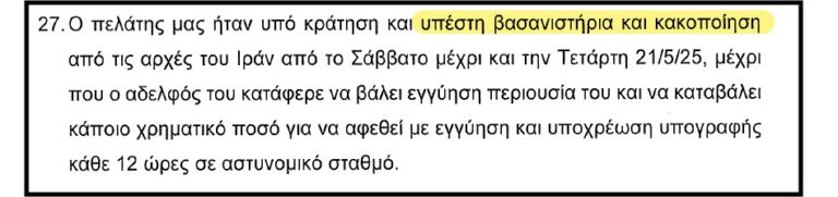 Τα όσα περιγράφονταν εξάλλου στην επιστολή της δικηγόρου του, προς την Αρχή Διερεύνησης Ισχυρισμών και Παραπόνων κατά της Αστυνομίας (ΑΔΙΠΑ) φάνταζαν και φαντάζουν, τουλάχιστον εξωφρενικά, αφού γινόταν λόγος για παράνομες ενέργειες αστυνομικών, όπως ξυλοδαρμοί, απειλές, νάρκωση, εξευτελισμός και τελικώς απέλασή του 40χρονου στη Τεχεράνη, χωρίς προηγουμένως να του δοθεί η ευκαιρία να μιλήσει με την οικογένεια ή με τη δικηγόρο του, αλλά και χωρίς να του επιδοθεί οποιοδήποτε διάταγμα απέλασης.