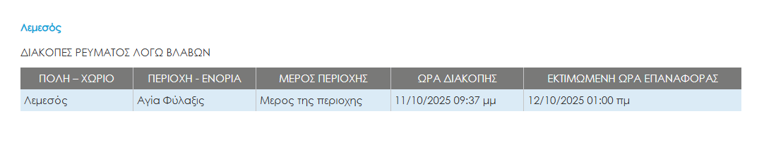 Χωρίς ρεύμα έμεινε περιοχή στη Λεμεσό, λόγω βλάβης στο δίκτυο της ΑΗΚ.