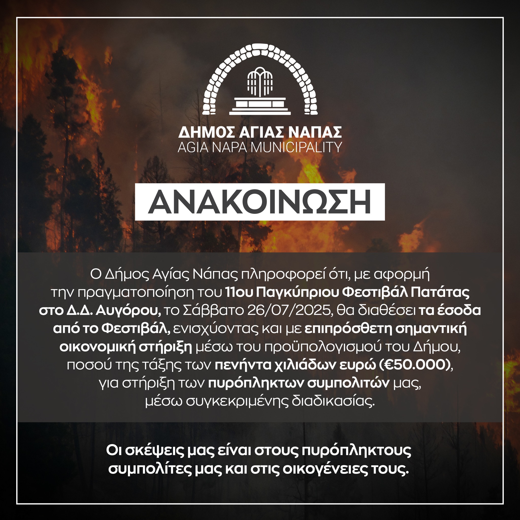 Στους πυρόπληκτους της ορεινής Λεμεσού θα διατεθούν όλα τα έσοδα από το 11ο Παγκύπριο Φεστιβάλ Πατάτας που θα διεξαχθεί το Σάββατο 26 Ιουλίου 2025 στο Δημοτικό Στάδιο Αυγόρου, μετά από απόφαση του Δήμου Αγίας Νάπας.