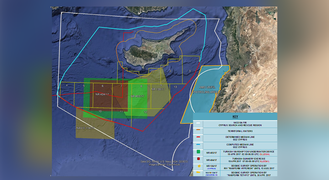 Στη θαλάσσια περιοχή νοτιοδυτικά της Κύπρου και εντός των οικοπέδων Έξι, Επτά και Οκτώ και μέρος του οικοπέδου Πέντε της Αποκλειστικής Οικονομικής Ζώνης της Κυπριακής Δημοκρατίας, θα συνεχιστούν αύριο οι παράνομες στρατιωτικές ασκήσεις του τουρκικού στρατού.