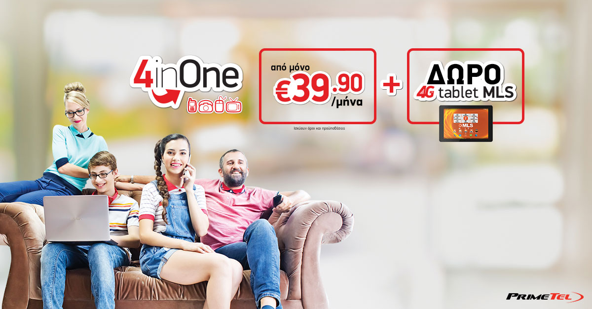 Η PrimeTel υποδέχεται τη νέα σεζόν με κορυφαίες λύσεις επικοινωνίας και ψυχαγωγίας 4inOne για όλη την οικογένεια. Τι σημαίνει αυτό; Κάθε νέος συνδρομητής μπορεί να αποκτήσει πρόσβαση σε όλες τις υπηρεσίες PrimeTel –κινητή, σταθερή, internet και τηλεόραση- μόνο με €39.90. Το 4inOne, σχεδιασμένο να προσφέρει προσιτές λύσεις επικοινωνίας μέσα από ένα ολοκληρωμένο πακέτο υπηρεσιών, περιλαμβάνει:
