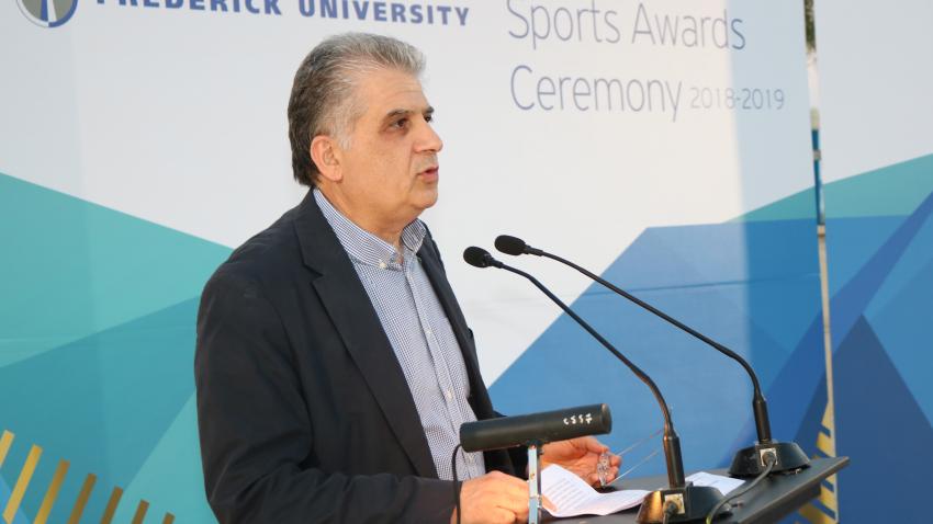 Στον χαιρετισμό του ο Πρύτανης του Πανεπιστημίου Frederick, Καθηγητής Γιώργος Δημοσθένους, υπογράμμισε τη σημασία που δίνει το Πανεπιστήμιο Frederick στον αθλητισμό στο πλαίσιο των εξιδεικευμένων ακαδημαϊκών προγραμμάτων που προσφέρει, αλλά και στηρίζοντας πολύπλευρα τους φοιτητές-αθλητές με υποτροφίες και άλλες διευκολύνσεις. Σημείωσε ότι πέραν των 120 φοιτητών απολαμβάνουν υποτροφίες σε όλα τα προγράμματα σπουδών εξαιτίας της αθλητικής τους δραστηριότητας. Ιδιαίτερη αναφορά έκανε και στο καινοτόμο πρόγραμμα σπουδών «Επιστήμη Φυσικής Αγωγής και Αθλητισμού» του Πανεπιστημίου Frederick, το οποίο παρέχει στους φοιτητές και τις φοιτήτριες τη δυνατότητα να αποκτήσουν σύγχρονες γνώσεις και δεξιότητες στη φυσική αγωγή και τον αθλητισμό, εμβαθύνοντας στον αθλητικό τουρισμό και αθλητισμό αναψυχής και παρέχοντας εξειδίκευση στην προπονητική των αθλημάτων – όπως για παράδειγμα στα αθλήματα θαλάσσης, στον κλασικό αθλητισμό, στα ομαδικά, γυμναστικά και μαχητικά αθλήματα – καθώς επίσης και στον τομέα της υγείας και ευρωστίας του ατόμου.
