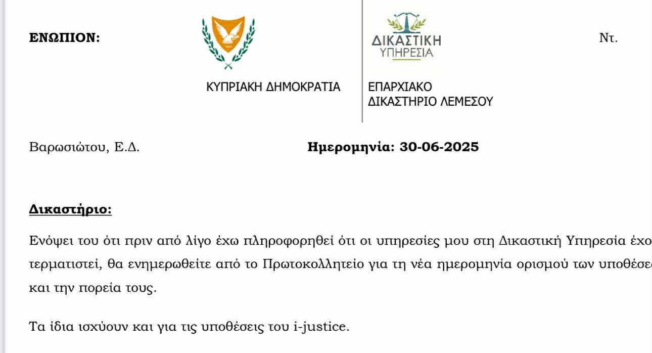Τον τερματισμό των υπηρεσιών της Ντόριας Βαρωσιώτου στη Δικαστική Υπηρεσία αποφάσισε το Ανώτατο Δικαστικό Συμβούλιο, μετά από διετή δοκιμαστική περίοδο που είχε υπηρετήσει στο Επαρχιακό Δικαστήριο Λεμεσού.