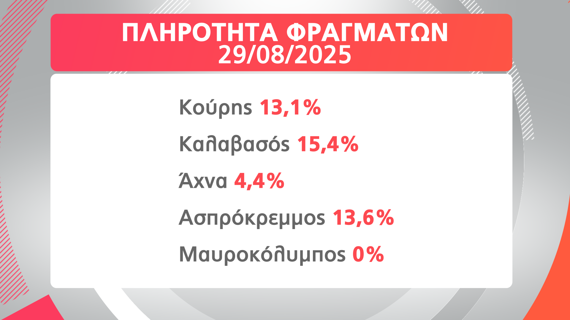 Πιο συγκεκριμένα στο φράγμα του Κούρη που είναι το μεγαλύτερο στη χώρα μας η πληρότητα στις 29 Αυγούστου ήταν στο 13,1% ενώ τώρα είναι στο 12,9%, στο φράγμα της Καλαβασού η πληρότητα ήταν στο 15,4% ενώ τώρα είναι στο 15,2%, της Άχνας στο 4,4% και τώρα είναι στο 4,3%, του Ασπρόκρεμμου στο 13,6% και τώρα είναι στο 13,3% και του Μαυροκόλυμπου στο απόλυτο 0%. Η συνολική πληρότητα των φραγμάτων είναι στο 14,5%.