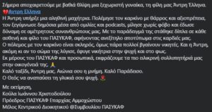 Το Κέντρο Μαστού την αποχαιρετά τονίζοντας ότι με τη μαχητικότητα, την αισιοδοξία και τη σπάνια ψυχική της δύναμη, υπήρξε πηγή έμπνευσης για όλες τις γυναίκες που έδωσαν και δίνουν τον δικό τους αγώνα.