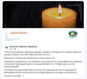 Το Κοινοτικό Συμβούλιο Ορμήδειας εκφράζει τη βαθιά του θλίψη για τον αδόκητο χαμό του Αργύρη Γεωργίου και απευθύνει θερμά συλλυπητήρια προς τους οικείους του.