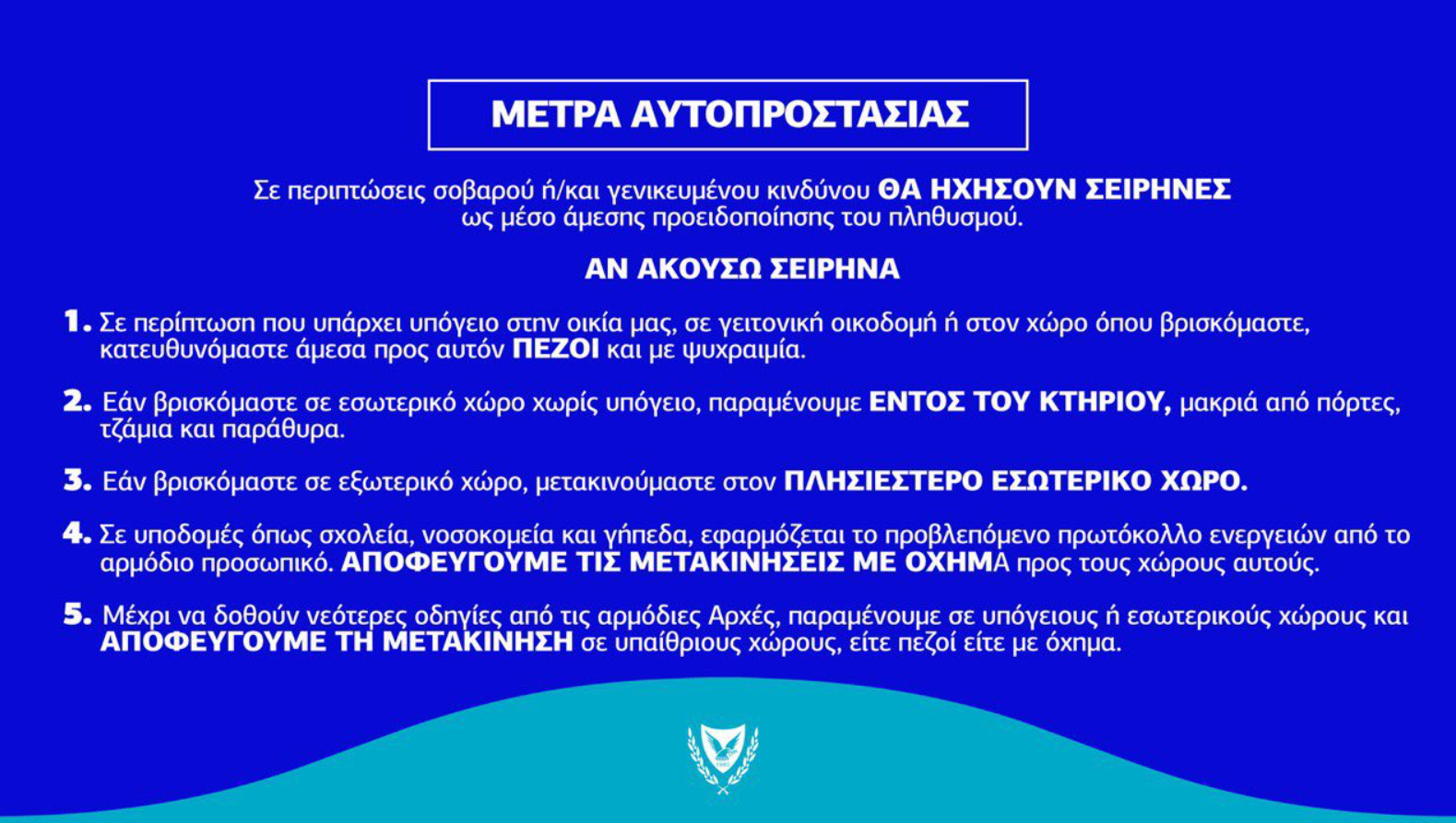 Τα μέτρα αυτοπροστασίας που πρέπει να λάβουν οι πολίτες σε περίπτωση που ηχήσουν σειρήνες, γνωστοποιεί η κυβέρνηση.