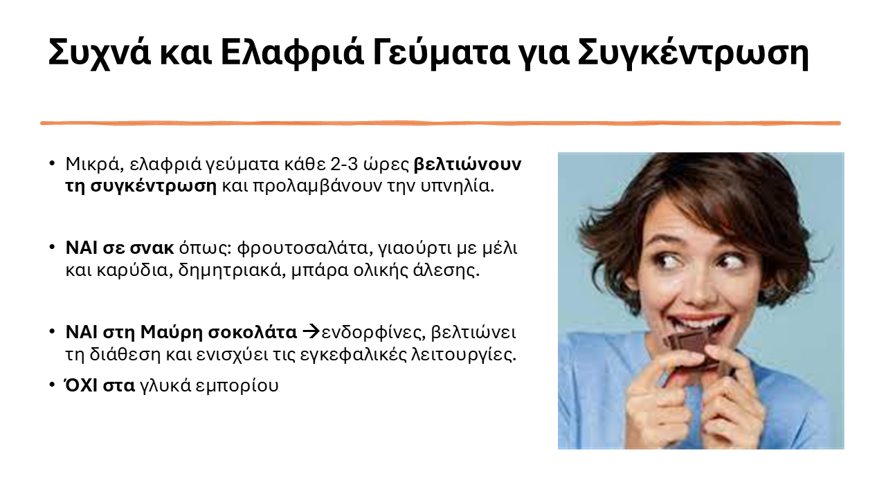 Είναι σημαντικό να τρώμε μικρά και ελαφριά γεύματα κάθε δύο με τρεις ώρες, καθώς βελτιώνουν τη συγκέντρωση και προλαμβάνουν την υπνηλία.