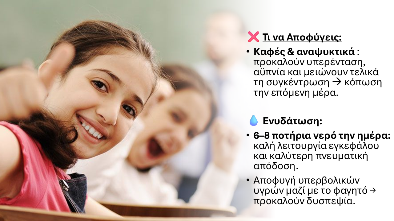 Εξαιρετικά σημαντικό πάντως είναι να πίνουμε τουλάχιστον 6-8 ποτήρια νερό τη μέρα, καθώς αυτό θα βοηθήσει στην καλή λειτουργία του εγκεφάλου και στην καλύτερη πνευματική απόδοση.