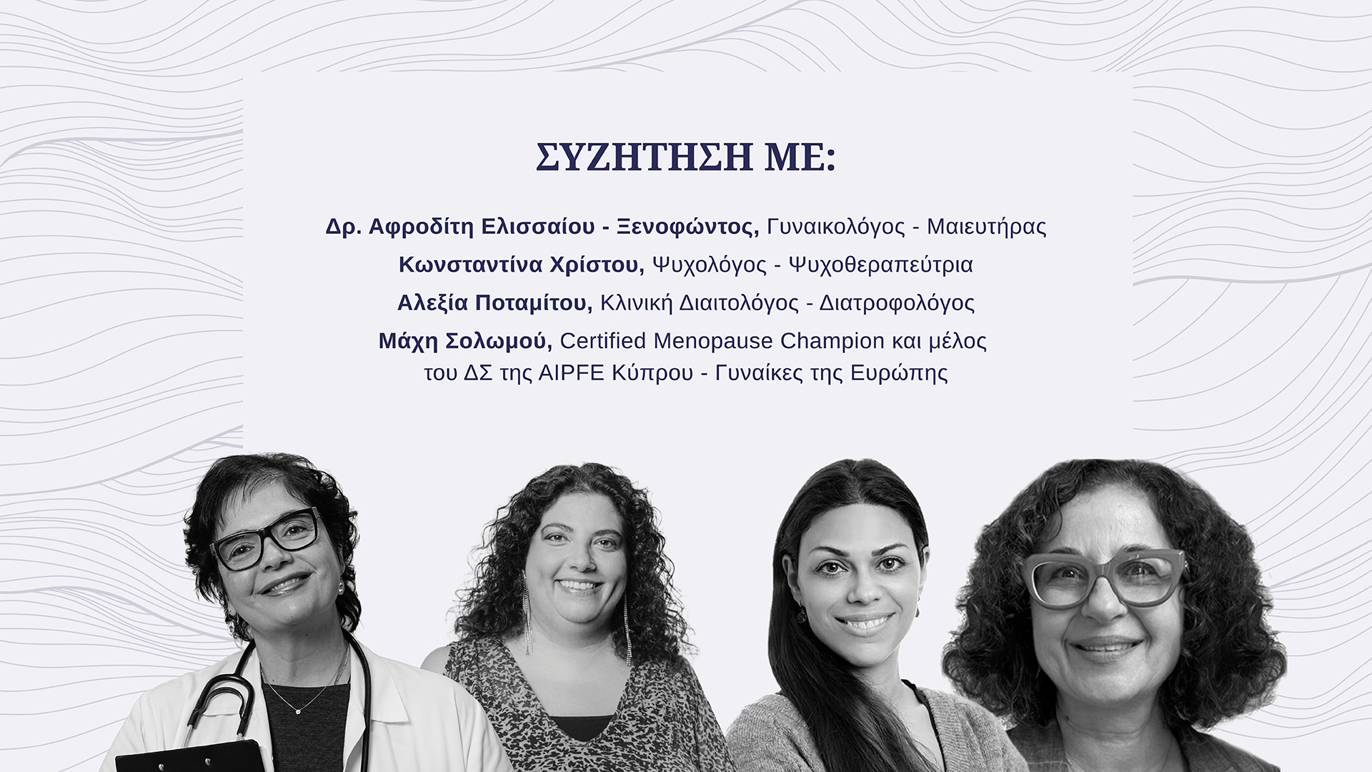 Συγκεκριμένα, μετά την προβολή του ντοκιμαντέρ, θα ακολουθήσει συζήτηση με τη συμμετοχή της Δρος Αφροδίτης Ελισσαίου-Ξενοφώντος, γυναικολόγου – μαιευτήρα στο Ιατρικό Κέντρο Μητέρα και Παιδί, της ψυχολόγου – ψυχοθεραπεύτριας Κωνσταντίνας Χρίστου, της κλινικής διαιτολόγου – διατροφολόγου Αλεξίας Ποταμίτου και της Μάχης Σολωμού, μέλους του ΔΣ της AIPFE Κύπρου – Γυναίκες της Ευρώπης και Certified Menopause Champion.