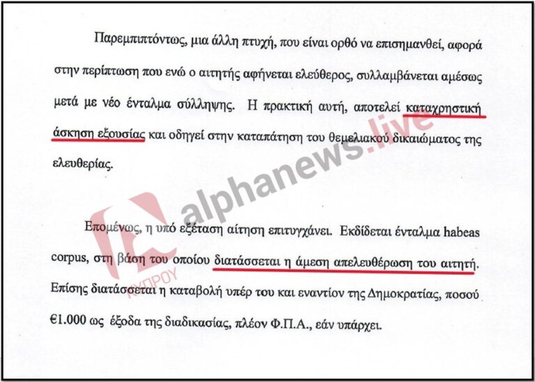 Το AlphaNews.Live μετά από έρευνα των καταγγελιών συγκέντρωσε στοιχεία και πρακτικά υποθέσεων που εκ πρώτης φαίνεται να επιβεβαιώνουν τις καταγγελίες των δικηγόρων, ενώ την ίδια ώρα γεννούν σοβαρά ερωτήματα σε σχέση με τη νομιμότητα και συνταγματικότητα των ακολουθούμενων πρακτικών της διοίκησης. Μάλιστα, για μία από αυτές τις υποθέσεις, το Ανώτατο Δικαστήριο με πρόσφατη απόφαση-κόλαφο έκρινε πως η πρακτική όπου αιτητής αφήνεται με απόφαση δικαστηρίου ελεύθερος και συλλαμβάνεται αμέσως μετά με νέο ένταλμα σύλληψης, αποτελεί καταχρηστική άσκηση εξουσίας και οδηγεί στην καταπάτηση του θεμελιακού δικαιώματος της ελευθερίας.