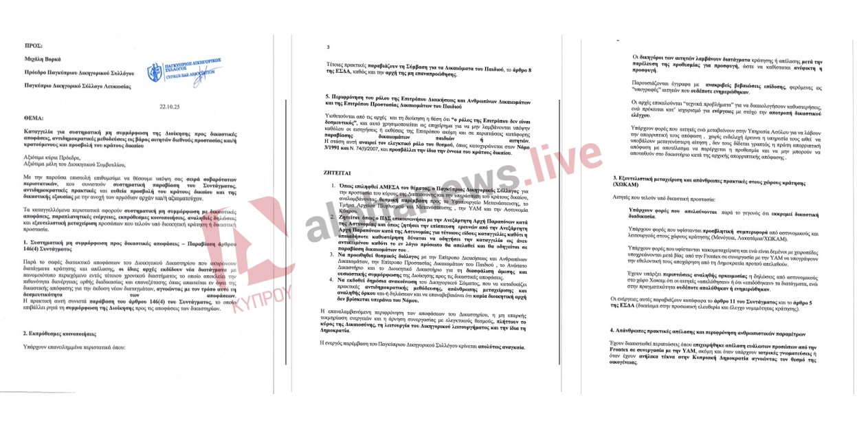 Στην επιστολή τους προς τον Παγκύπριο Δικηγορικό Σύλλογο και τον Πρόεδρό του, Μιχάλη Βορκά, οι δικηγόροι κάνουν λόγο για συστηματική μη συμμόρφωση της Διοίκησης προς δικαστικές αποφάσεις, αντιδημοκρατικές μεθοδεύσεις εις βάρος αιτητών διεθνούς προστασίας, προσβολή του Κράτους Δικαίου και της Δικαστικής εξουσίας, συστηματικές παραβιάσεις του Συντάγματος μέσω παραπλανητικών ενεργειών, εκπρόθεσμων κοινοποιήσεων, αναληθών δηλώσεων και εξευτελιστικής μεταχείρισης προσώπων που τελούν υπό διοικητική κράτηση ή δικαστική προστασία.