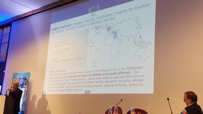 Κατά το συνέδριο που διοργάνωσε στις Βρυξέλλες η ΕΕ για όλα τα καινούργια έργα του προγράμματος «Erasmus+ CBHE Grantholder’s Meeting”, το έργο RefTeCp για την ανάπτυξη ενός Προγράμματος Πιστοποίησης των Διδακτικών Ικανοτήτων Αιγυπτίων και Προσφύγων Εκπαιδευτικών μέσω ενός Συστήματος Κατάρτισης που Συνδυάζει Δια Ζώσης και Εξ Αποστάσεως Εκπαίδευση, είχε επιλεγεί μαζί με άλλα 4 από τα 147 έργα για να παρουσιαστεί από τον συντονιστή του ως ένα από τα καλύτερα παραδείγματα έργων που έχουν εγκριθεί.