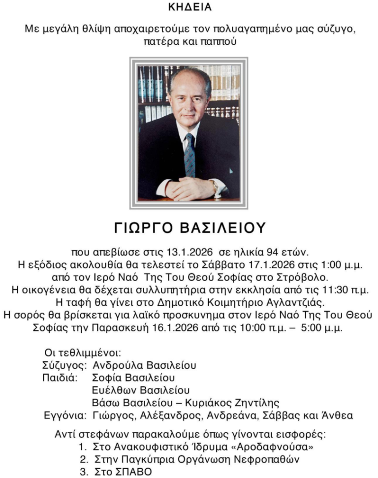 Το ερχόμενο Σάββατο 17 Ιανουαρίου θα τελεστεί η κηδεία του πρώην Προέδρου της Κυπριακής Δημοκρατίας, Γιώργου Βασιλείου, ο οποίος «έφυγε» από τη ζωή σε ηλικία 94 ετών.