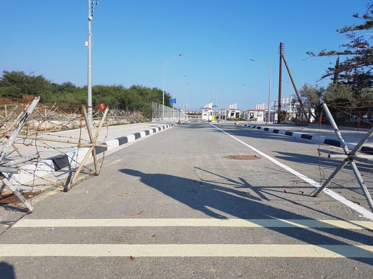Στο βάθος διακρίνονται τα κουβούκλια της λεγόμενης “αστυνομίας”, τα οποία έχουν τοποθετηθεί για έλεγχο διαβατηρίων, ταυτοτήτων και ασφαλειών για διακίνηση οχημάτων στο ψευδοκράτος, καθώς και το γραφείο της Αστυνομίας Κύπρου, το οποίο στελεχώνεται και από λειτουργούς του Τμήματος Τελωνείων.