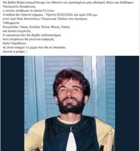 Η κηδεία του άτυχου Παναγιώτη θα τελεστεί από τον Ιερό Ναό Αποστόλων Πέτρου και Παύλου στο Αυγόρου στις 15:00. Παράκληση των οικείων του είναι αντί στεφάνων, να γίνονται εισφορές.