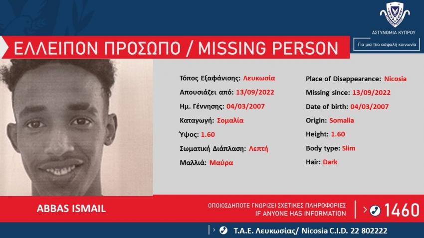 Η Αστυνομία ζητά πληροφορίες που μπορούν να βοηθήσουν στον εντοπισμό του ABBAS ISMAIL, 15 ετών, από τη Σομαλία, o οποίος απουσιάζει από το χώρο διαμονής του στη Λευκωσία, από τις 13/09/2022.Ο 15χρονος περιγράφεται ως ύψους 1.60μ. περίπου, λεπτής σωματικής διάπλασης, με μαύρα μαλλιά.
