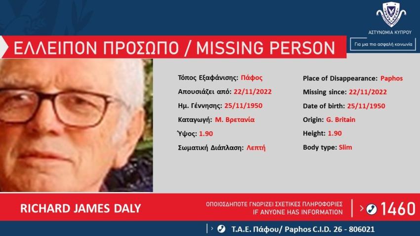 Η Αστυνομία ζητά πληροφορίες που μπορούν να βοηθήσουν στον εντοπισμό του RICHARD JAMES DALY, 72 ετών, από τη Μεγάλη Βρετανία, ο οποίος απουσιάζει από την οικία του στην Πέγεια, από σήμερα 22/11/2022, το πρωί.Η 72χρονος περιγράφεται ως ύψους 1.90μ. περίπου, λεπτής σωματικής διάπλασης με κοντά άσπρα μαλλιά και κατά την αναχώρηση του φορούσε κοντό μπεζ παντελόνι και φανέλα μπλε με κόκκινες και μαύρες ρίγες και άσπρα αθλητικά παπούτσια. Ο 72χρονος κουτσαίνει και κρατάει ξύλινο μπαστούνι.