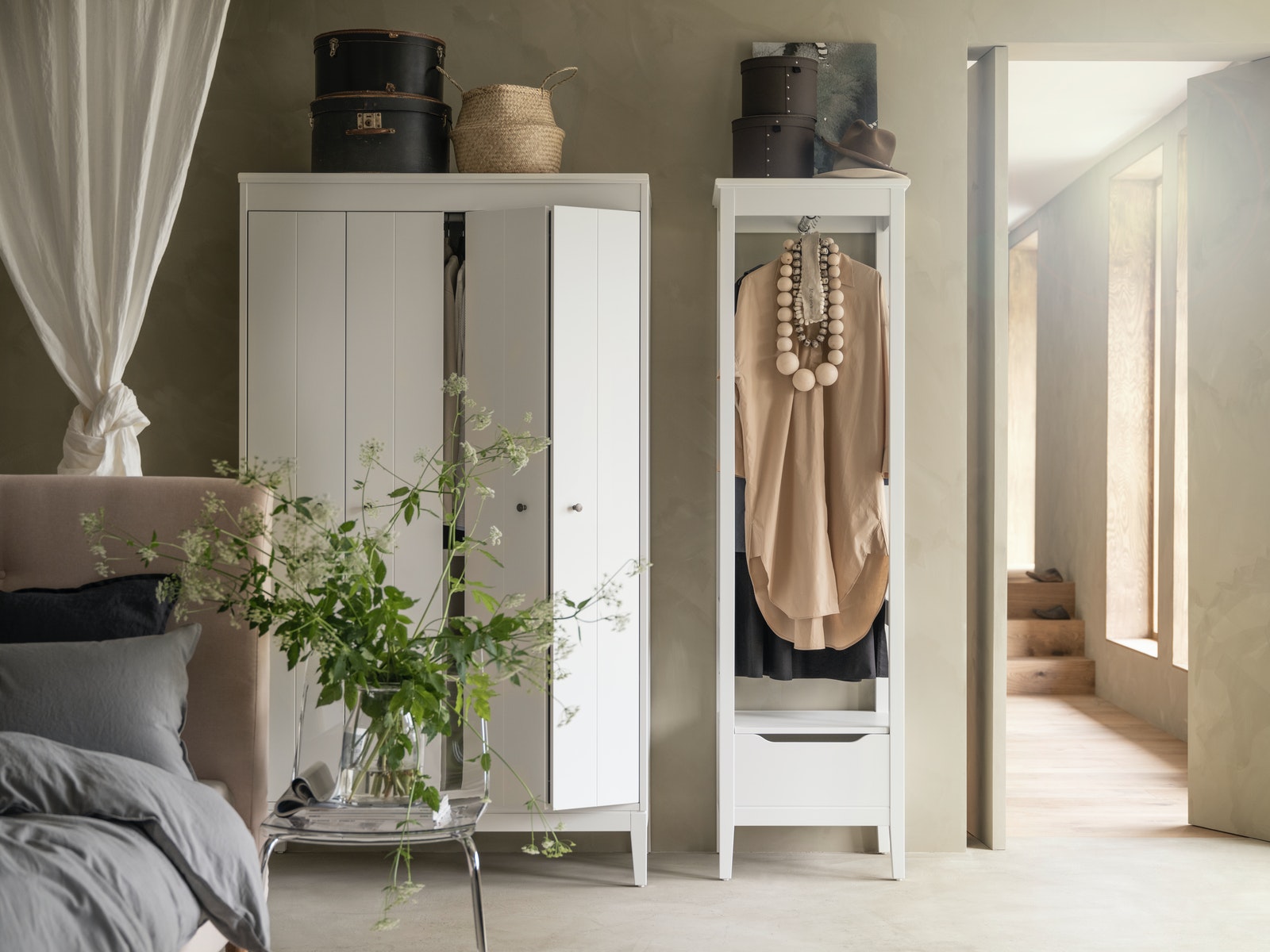 Στο υπνοδωμάτιο, μία λειτουργική ντουλάπα με συρτάρια, όπως η σειρά PAX, επιτρέπει την οργάνωση και αποθήκευση, με προσοχή, των ρούχων σας. Η κρεμαστή θήκη αποθήκευσης με διαχωριστικά BLÄDDRARE θα σας βοηθήσει να αποθηκεύσετε διάφορα ρούχα, όπως πουλόβερ ή αξεσουάρ, ενώ αξιοποιώντας και τις πλαϊνές θήκες που διαθέτει, κερδίζετε ακόμα περισσότερο χώρο. Αντίστοιχα, με τις θήκες τακτοποίησης BAXNA θα μπορείτε να βλέπετε ό,τι χρειάζεστε στα συρτάρια εύκολα, και να τα παίρνετε γρήγορα. Επιπλέον, χρησιμοποιήστε κουτιά αποθήκευσης που στοιβάζονται, όπως τα TJENA και τα ANILINARE που διαθέτουν διαχωριστικά για ρολόγια, κοσμήματα και άλλα μικροαντικείμενα. Σε αυτά, μπορείτε να γράψετε ή να βγάλετε μία φωτογραφία και να την κολλήστε απ’ έξω για να βρίσκετε εύκολα αυτό που ψάχνετε.