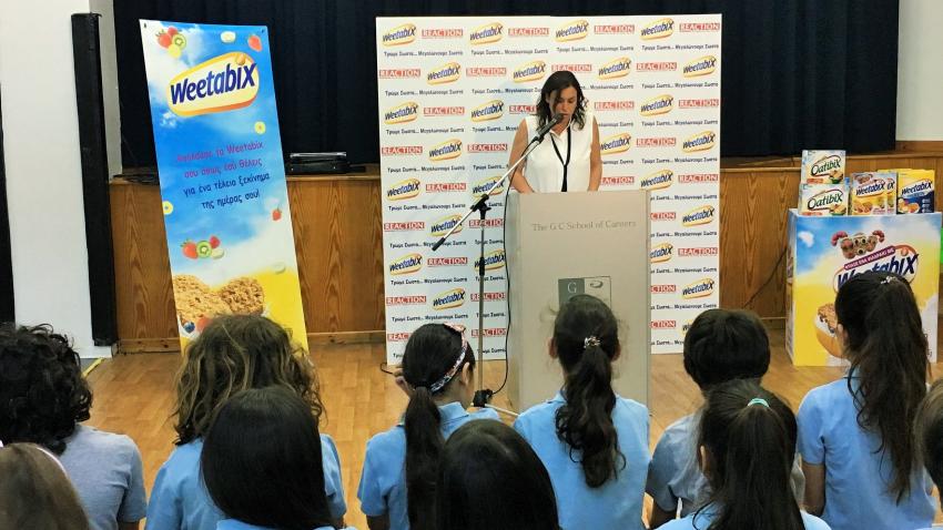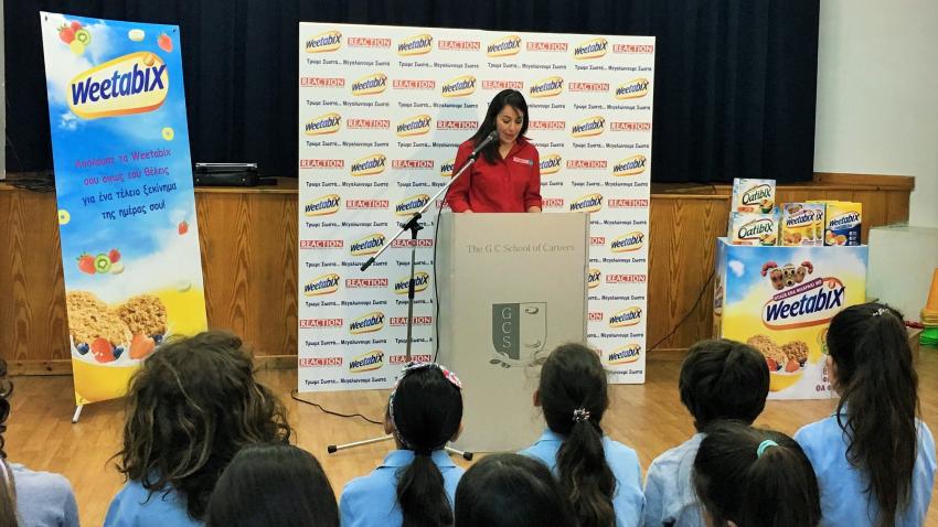 Στην παρουσία παιδιών, εκπροσώπων Υπουργείων και άλλων επισήμων ξεκίνησε το Εκπαιδευτικό Πρόγραμμα για τη Σωστή Διατροφή των παιδιών «Τρώμε Σωστά, μεγαλώνουμε σωστά» της Μονάδας Δημόσιας Υγείας του REACTION σε συνεργασία με τα δημητριακά προγεύματος Weetabix. Η παρουσίαση έλαβε χώρα στο Ελληνικό Δημοτικό Σχολείο GC School of Careers.