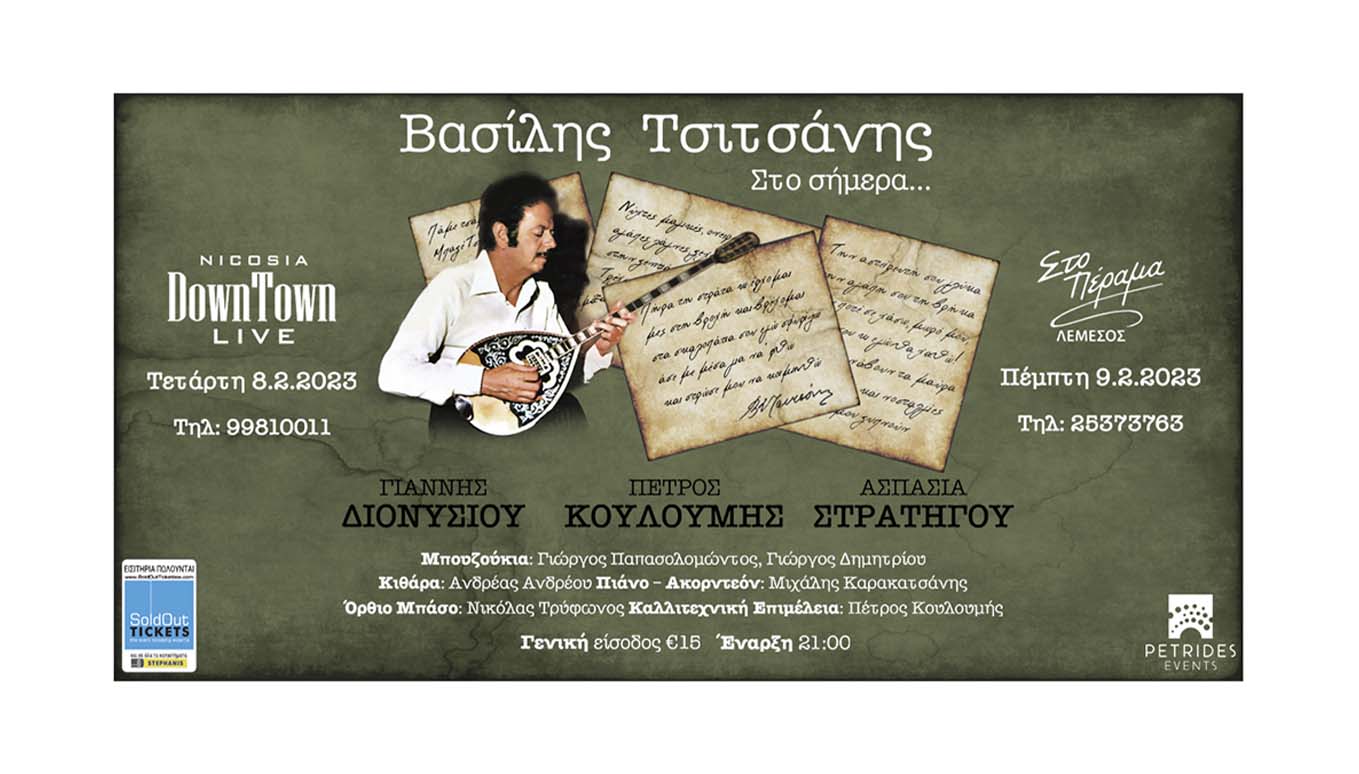 Η Petrides Events παρουσιάζει, δυο μοναδικές βραδιές αφιερωμένες στον Βασίλη Τσιτσάνη. Ο Γιάννης Διονυσίου ο Πέτρος Κουλουμής και η Ασπασία Στρατηγού, είναι τρεις νέοι ταλαντούχοι ερμηνευτές, με μεγάλη καλλιτεχνική πορεία και συνεργασίες στο ενεργητικό τους. Ενώνουν τις δυνάμεις τους μαζί με 5 κορυφαίους μουσικούς και αναλαμβάνουν το μεγαλεπήβολο έργο να παρουσιάσουν τα τραγούδια του μοναδικού Βασίλη Τσιτσάνη με την αισθαντικότητα, την αισθητική αλλά και την φρεσκάδα που φέρουν οι ίδιοι.