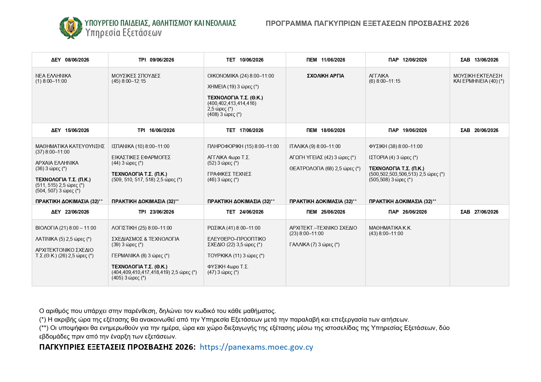 Aπό τις 8 μέχρι τις 26 Ιουνίου 2026 θα διαρκέσουν φετινές οι Παγκύπριες Εξετάσεις, σύμφωνα με το πρόγραμμα που δημοσιοποίησε πριν από λίγο η η Υπηρεσία Εξετάσεων της Διεύθυνσης Ανώτερης Εκπαίδευσης του Υπουργείου Παιδείας, Αθλητισμού και Νεολαίας.