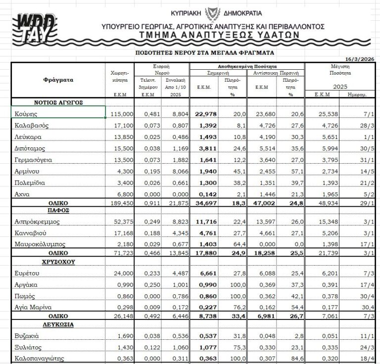 Κληθείς να σχολιάσει τις βροχές των τελευταίων ημερών στην επαρχία Πάφου, ο κ. Κασιουλής είπε πως κάθε βροχόπτωση είναι ευεργετική γιατί τα αποθέματα στα φράγματα παραμένουν σε πολύ χαμηλά επίπεδα. Οι αυξανόμενες ανάγκες, όπως είπε, επιβάλλουν την ανάγκη για ορθολογιστική διαχείριση του νερού.