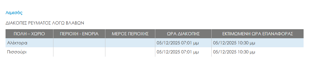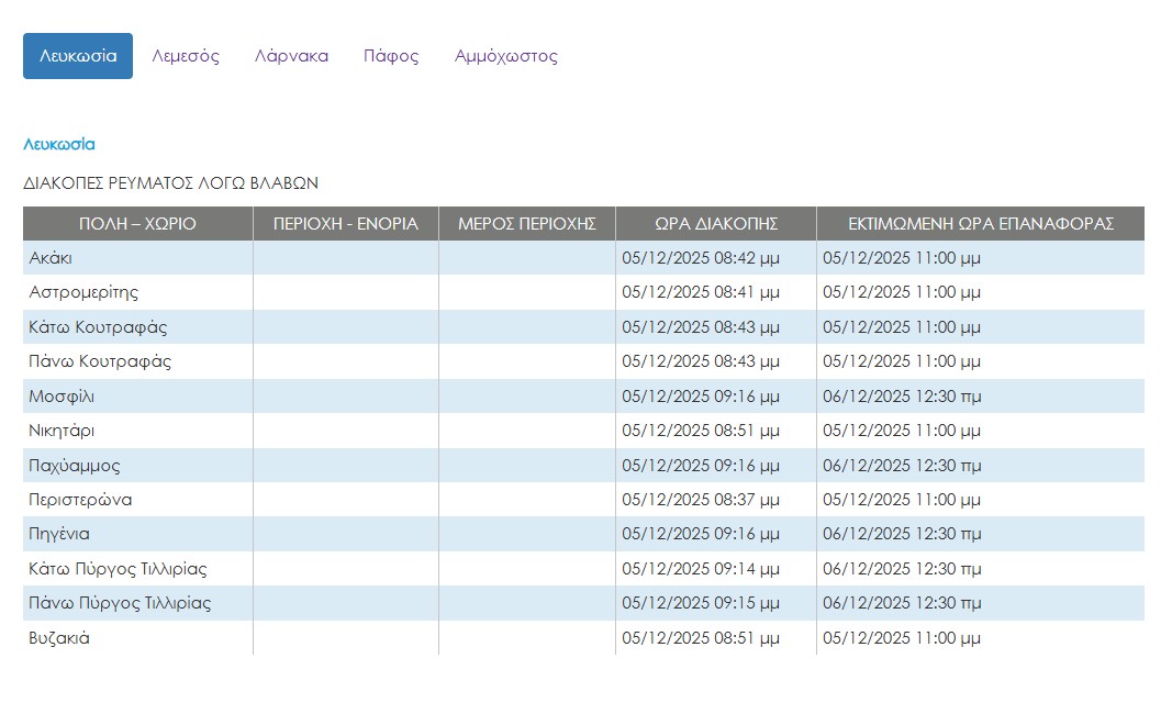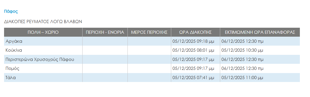 Στο μεταξύ, αρκετές περιοχές της Κύπρου έμειναν χωρίς ρεύμα λόγω της κακοκαιρίας. Οι περισσότερες διακοπές ρεύματος μέχρι στιγμής παρατηρούνται στη Λευκωσία. Διακοπές ρεύματος ωστόσο είχαμε και στις επαρχίες Πάφου και Λεμεσού.