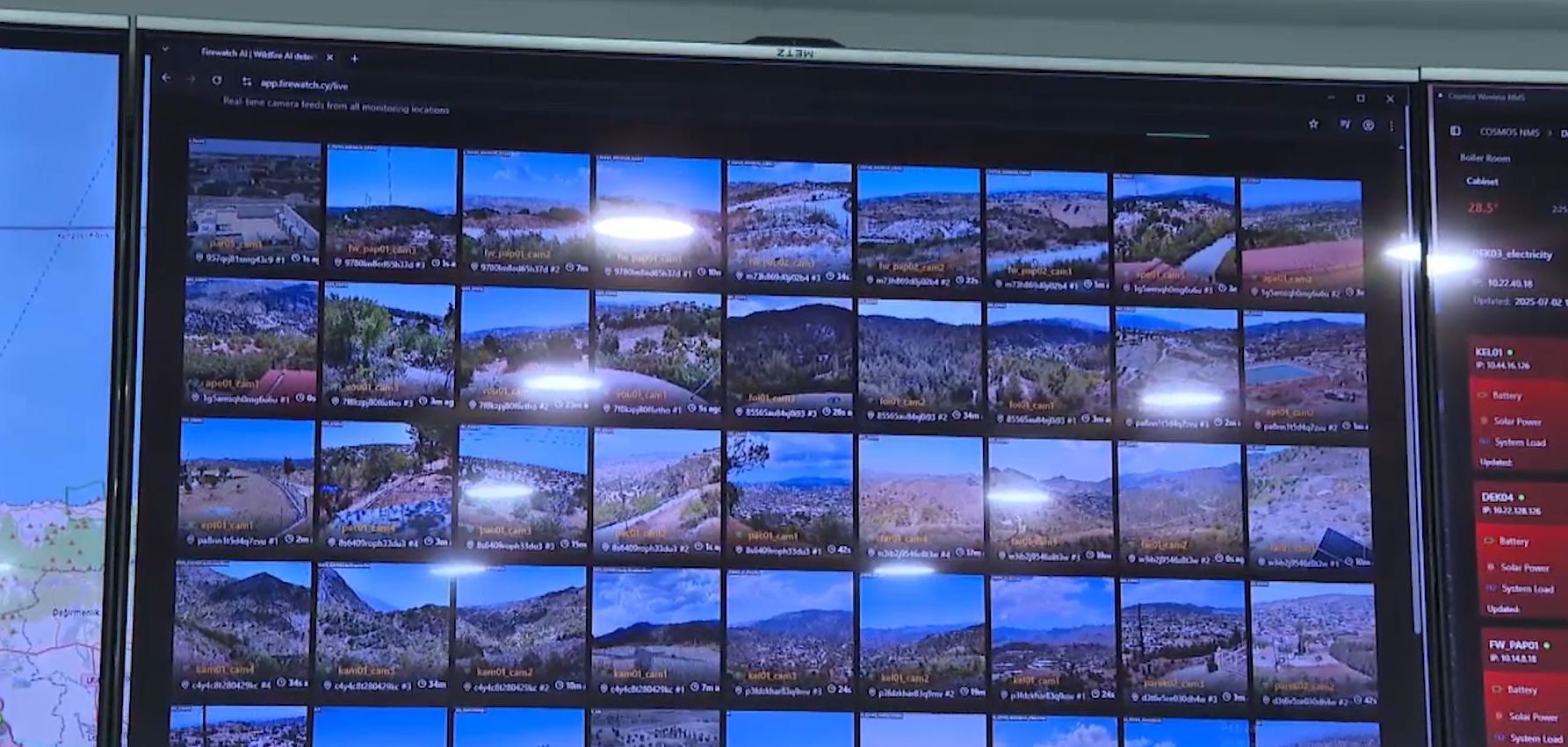 Το Alphanews.Live βρέθηκε στο κέντρο ελέγχου της Firewatch AI, όπου 24 ώρες το 24ωρο, λειτουργοί ελέγχουν τις κάμερες, οι οποίες καλύπτουν το 25% της έκτασης της Κύπρου και ανιχνεύουν έγκαιρα καπνό η φωτιά.
