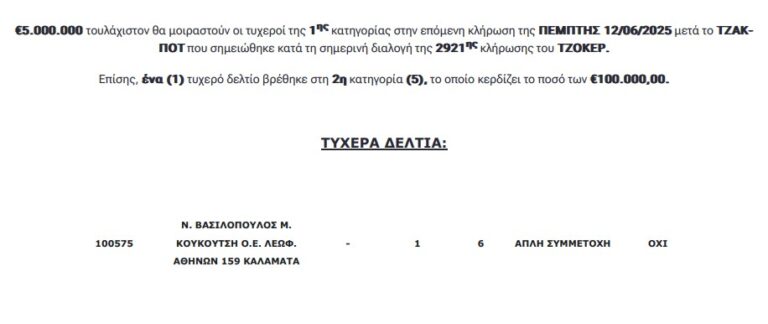 Συγκεκριμένα, €5.000.000 τουλάχιστον θα μοιραστούν οι τυχεροί της 1ης κατηγορίας στην επόμενη κλήρωση της Πέμπτης 12/06/2025 μετά το ΤΖΑΚ-ΠΟΤ που σημειώθηκε κατά τη σημερινή διαλογή της 2921ης κλήρωσης του ΤΖΟΚΕΡ.