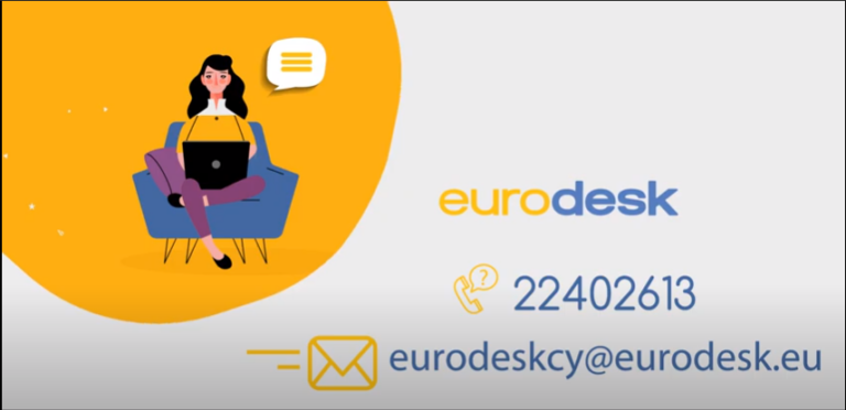 Επικοινώνησε σήμερα με το Eurodesk Cyprus: Θέσε τα ερωτήματά σου τηλεφωνικά (22402613) ή μέσω e-mail ([email protected]), επισκέψου την ιστοσελίδα μας http://eurodesk.onek.org.cy και την Ευρωπαϊκή Διαδικτυακή Πύλη Νεολαίας http://europa.eu/youth. Μπορείς να  βρεις το Eurodesk σε όλα τα Μέσα Κοινωνικής Δικτύωσης, Facebook, Instagram, Twitter και LinkedIn, ακολουθώντας τον λογαριασμό “Eurodesk Cyprus”.
