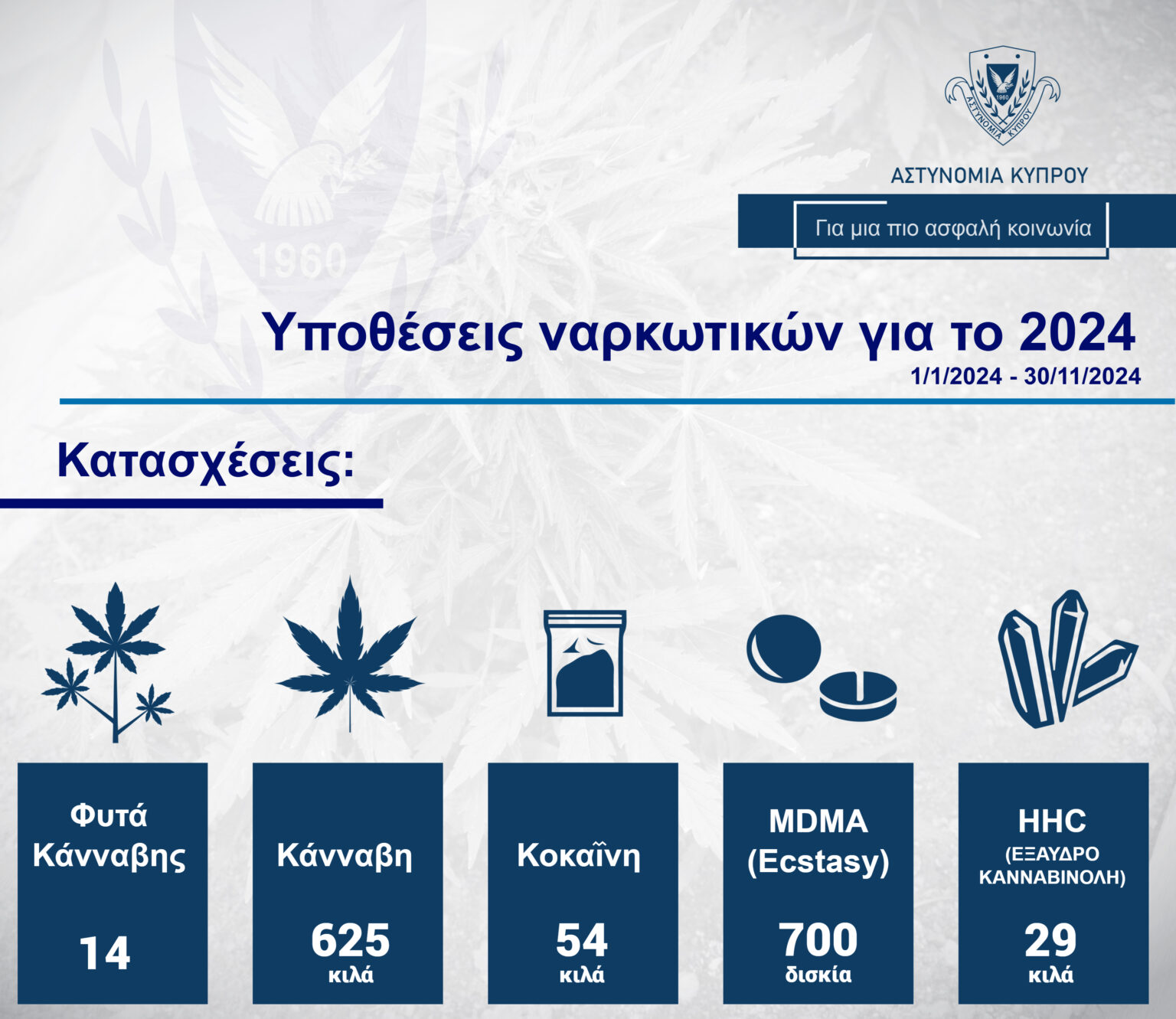 Συνολικά 1,008 υποθέσεις ναρκωτικών με 1,065 ενεχόμενα πρόσωπα έχουν διερευνηθεί σύμφωνα με την Αστυνομία από την 1η Ιανουαρίου, μέχρι και τις 30 Νοεμβρίου 2024.