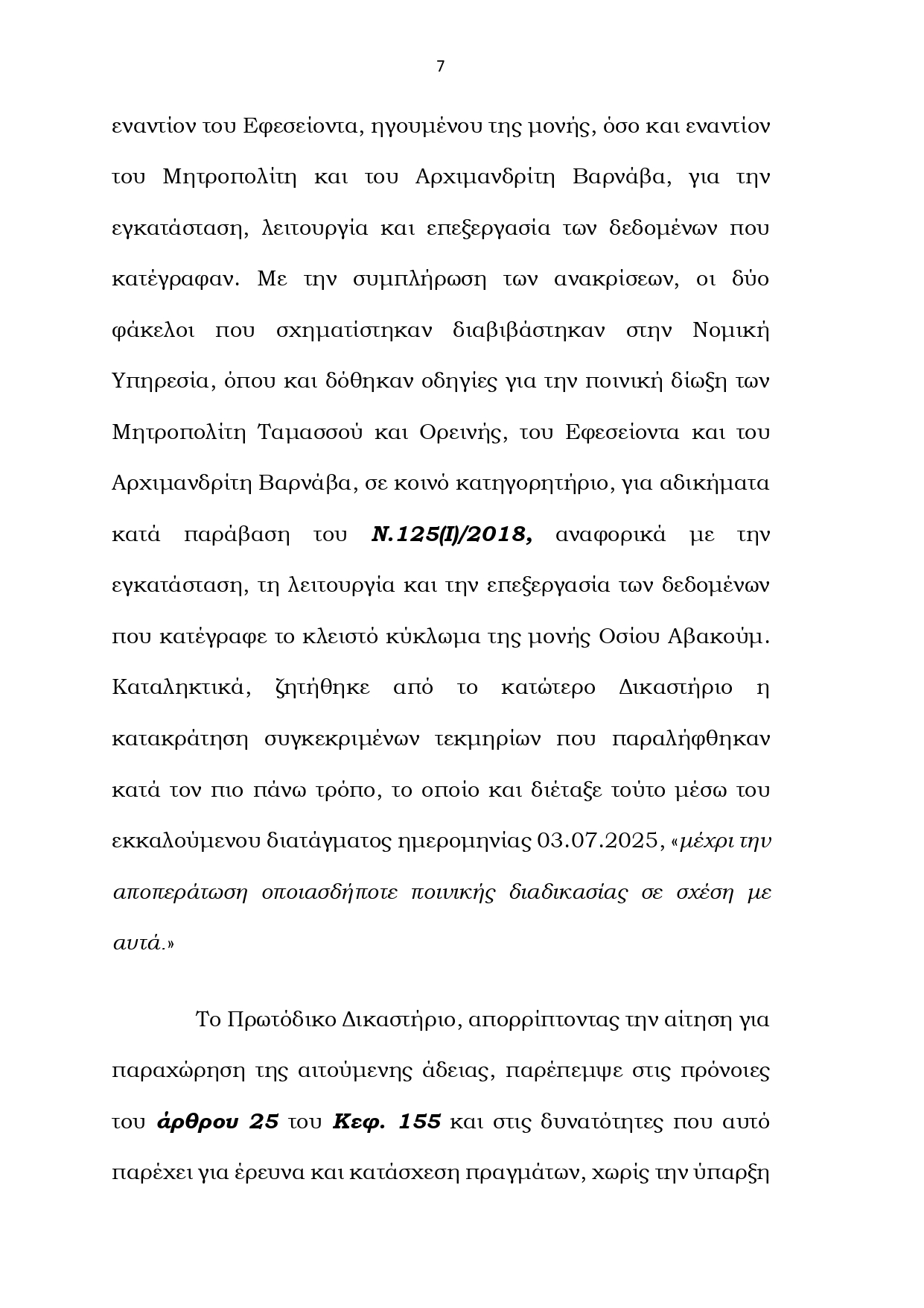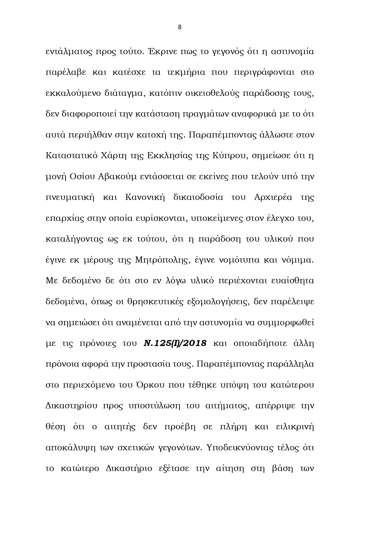 «Η απόφαση του Ανωτάτου Δικαστηρίου είναι ιδιαίτερης σημασίας, διότι αναγνωρίζει ότι εγείρονται σοβαρά ζητήματα νομιμότητας ως προς τον τρόπο με τον οποίο αποκτήθηκαν και κατακρατούνται κρίσιμα τεκμήρια στην υπόθεση. Το Δικαστήριο διαπιστώνει ότι το επίμαχο υλικό δεν περιήλθε στην κατοχή της Αστυνομίας στο πλαίσιο αστυνομικής έρευνας, όπως προβλέπει ο νόμος, αλλά μέσω οικειοθελούς παράδοσης από τρίτο πρόσωπο, δηλαδή τη Μητρόπολη. Αυτό από μόνο του ανοίγει, εκ πρώτης όψεως, ένα πολύ σοβαρό ζήτημα θεσμικής και συνταγματικής τάξης. Η υπόθεση δεν μπορεί να παρουσιάζεται ως απλή διοικητική ή ιδιοκτησιακή διαφορά: Η Μονή δεν είναι ένα ακίνητο που μπορεί κάποιος να επικαλείται ότι του “ανήκει” κατά το δοκούν. Είναι ο τόπος κατοικίας, άσκησης πίστης και ιδιωτικής ζωής των μοναχών. Οι μοναχοί έχουν δικαιώματα που προστατεύονται από το Σύνταγμα και το ευρωπαϊκό δίκαιο, τα οποία δεν μπορούν να παραμερίζονται στο όνομα οποιασδήποτε εξουσίας ή αυθαίρετης παρέμβασης. Μιλάμε για υλικό που αφορά την ιδιωτική ζωή εντός της Μονής και περιλαμβάνει άκρως ευαίσθητα προσωπικά και θρησκευτικά δεδομένα, ακόμη και εξομολογήσεις. Πρόκειται για τον σκληρό πυρήνα της προστασίας που παρέχουν το Σύνταγμα και η Ευρωπαϊκή Σύμβαση Δικαιωμάτων του Ανθρώπου. Το Ανώτατο άνοιξε τον δρόμο ώστε να εξεταστούν ουσιαστικά τα ζητήματα αυτά μέσω της διαδικασίας certiorari. Σε μια δημοκρατία, κανείς, ούτε κρατικός ούτε εκκλησιαστικός θεσμός, δεν μπορεί να λειτουργεί υπεράνω των νόμων και των δικαιωμάτων που προστατεύουν την ανθρώπινη αξιοπρέπεια και την ιδιωτικότητα».