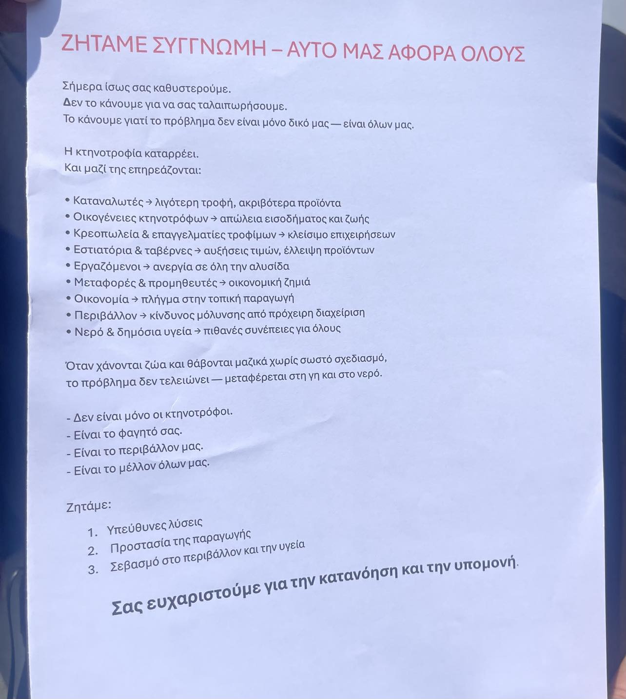 Κτηνοτρόφοι ετοίμασαν και μοίρασαν στους διερχόμενους οδηγούς φυλλάδιο μέσω του οποίου ζητούν συγγνώμη για την ταλαιπωρία.
