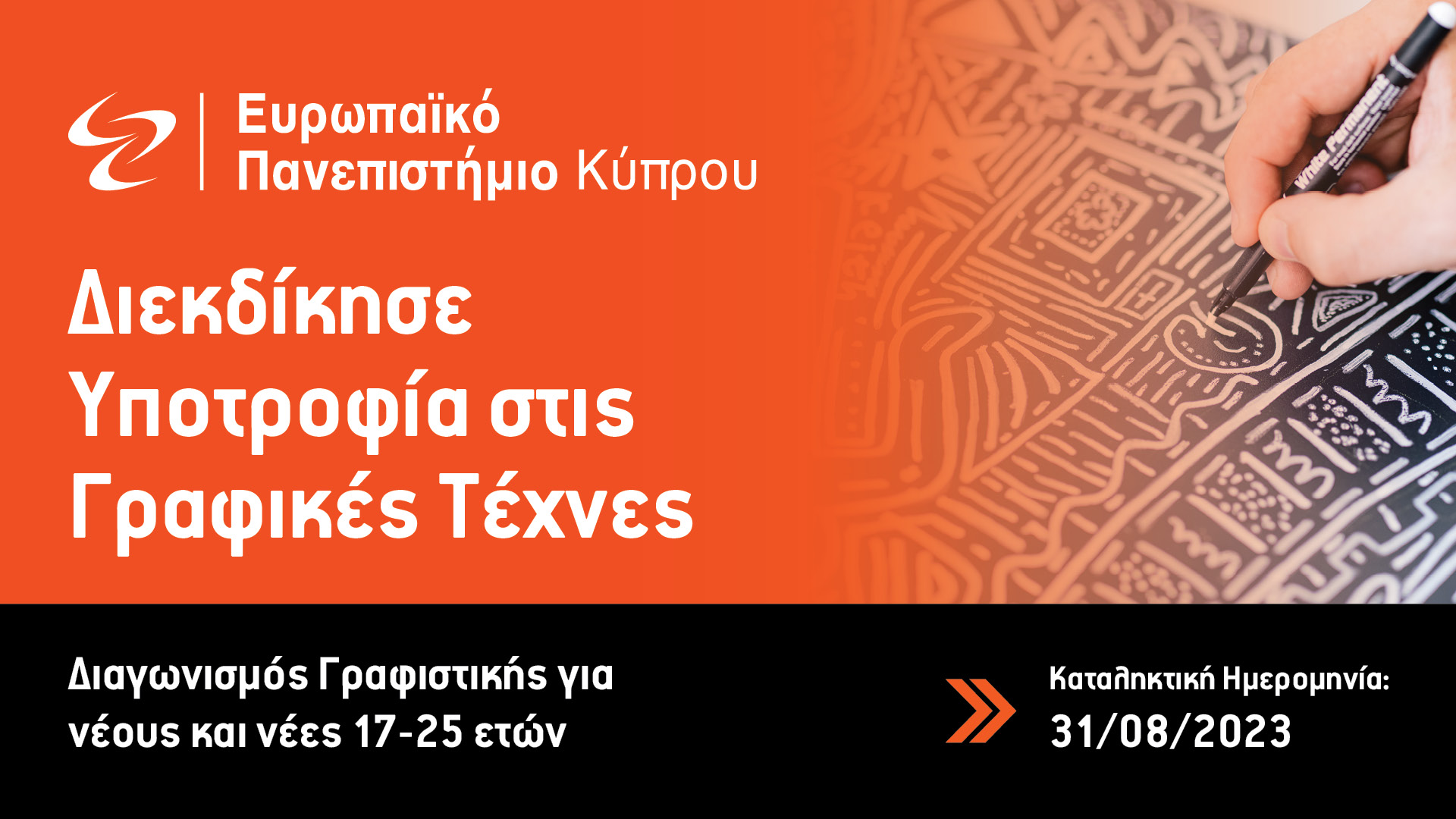 Το Τμήμα Τεχνών του Ευρωπαϊκού Πανεπιστημίου Κύπρου διοργανώνει Διαγωνισμό Γραφιστικής για νέους και νέες 17-25 ετών με τη δυνατότητα διεκδίκησης υποτροφίας για σπουδές  στο Πρόγραμμα Γραφικών Τεχνών του Ευρωπαϊκού Πανεπιστημίου Κύπρου.