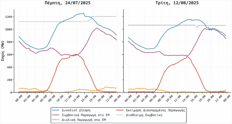 - Στις 12 Αυγούστου 2025 (Εικόνα 1), η συνολική ζήτηση ήταν χαμηλότερη, με μέγιστο στα 1.158 MW. Όμως, στο ίδιο απογευματινό διάστημα η αιχμή έφτασε τα 1.087 MW, με τη διαθέσιμη συμβατική ισχύ να περιορίζεται μόλις στα 1.062 MW. Η μικρή αυτή υστέρηση ήταν αρκετή για να προκαλέσει εκ περιτροπής διακοπές.