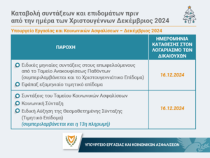 Το Υπουργείο Εργασίας και Κοινωνικών Ασφαλίσεων ανακοινώνει ότι ενόψει της εορταστικής περιόδου έχουν προωθηθεί όλες οι απαραίτητες διευθετήσεις για την καταβολή, πριν από την ημέρα των Χριστουγέννων, όλων των συντάξεων και επιδομάτων που εμπίπτουν στην αρμοδιότητά του.