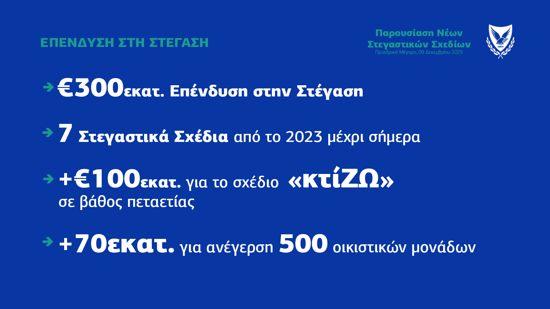 «Για τη δική μας κυβέρνηση, η δαπάνη στη στέγαση δεν προσεγγίζεται ως κόστος, αλλά ως επένδυση» σημείωσε και ανέφερε ότι συνολικά, «η μέχρι τώρα επένδυση της παρούσας κυβέρνησης στη στεγαστική πολιτική ξεπερνά τα 300 εκατομμύρια ευρώ, αριθμός ίσως μοναδικός για τα κυπριακά δεδομένα».