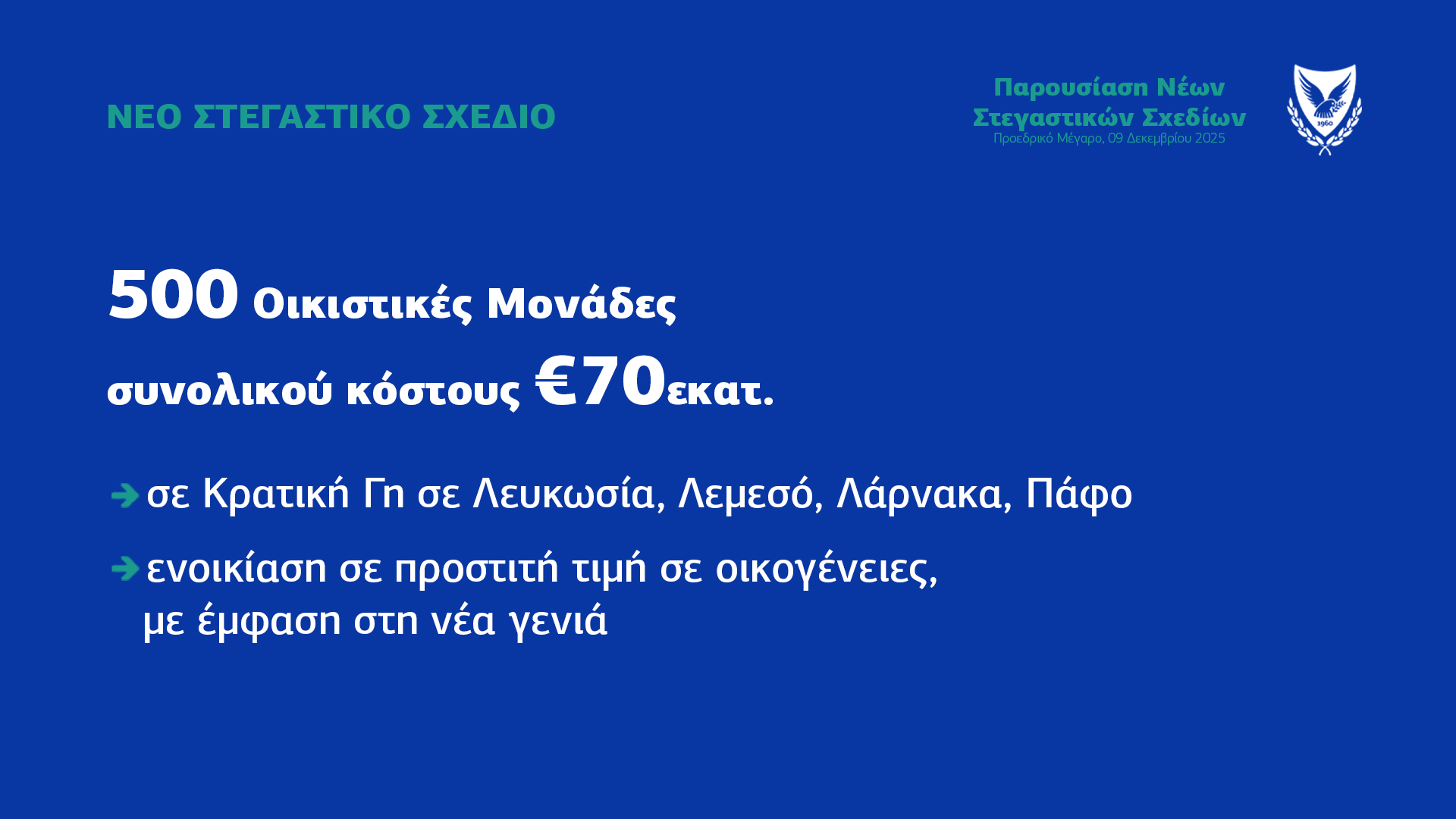 Ανακοινώνουμε σήμερα την κατασκευή 500 νέων οικιστικών μονάδων, οι οποίες θα παραχωρηθούν έναντι προσιτού ενοικίου, σε οικογένειες ή και μονήρη άτομα, στη βάση συγκεκριμένων κριτηρίων, με έμφαση στη Νέα Γενιά του τόπου μας.