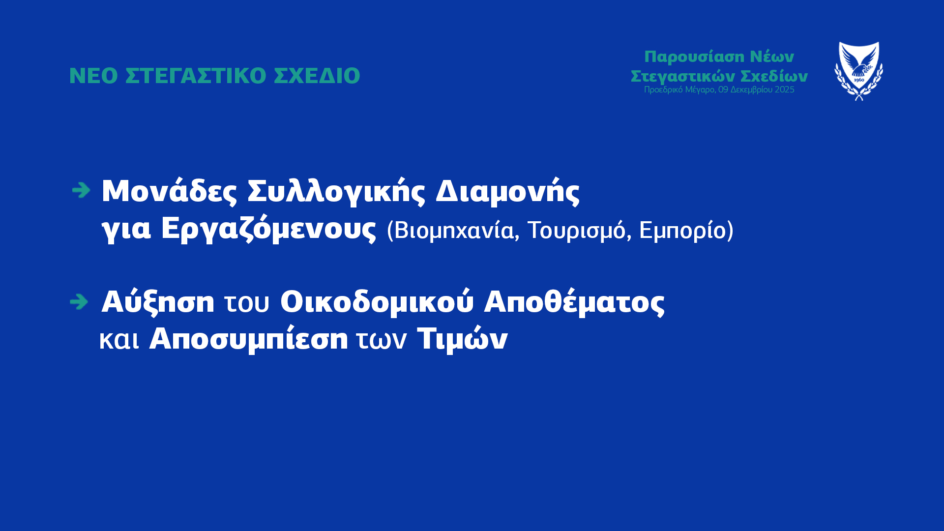 Στην ίδια εκδήλωση ο Υπουργός Εσωτερικών Κωνσταντίνος Ιωάννου εξήγγειλε το νέο στεγαστικό Σχέδιο Ανέγερσης Μονάδων Συλλογικής Διαμονής, το οποίο εμπίπτει στην ευρύτερη στρατηγική της Κυβέρνησης για στήριξη των κλάδων της βιομηχανίας, του τουρισμού και του εμπορίου. Το σχέδιο παρέχει τη δυνατότητα δημιουργίας λύσεων στέγασης για το προσωπικό που απασχολείται στους τομείς αυτούς.