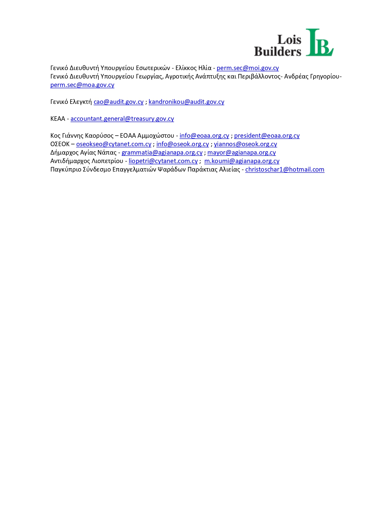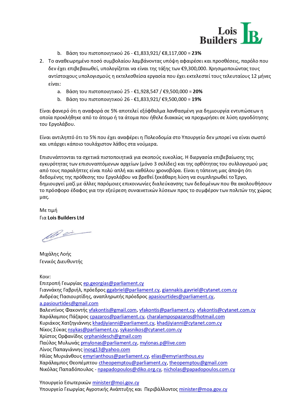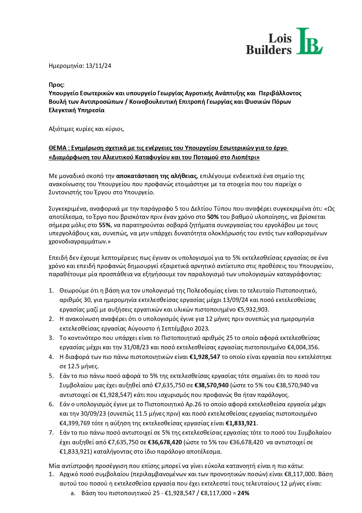 Εξασέλιδη επιστολή δίνει στη δημοσιότητα η εταιρεία Lois Builders, η οποία συντάχθηκε στις 13 Νοεμβρίου 2024 και εστάλη προς τα Υπουργεία Εσωτερικών και Γεωργίας, τη Βουλή των Αντιπροσώπων και την Ελεγκτική Υπηρεσία, στην οποία περιλαμβάνονται στοιχεία αναφορικά με τα όσα οδήγησαν σε λύση του συμβολαίου για κατασκευή του Αλιευτικού Καταφυγίου στον ποταμό Λιοπετρίου.