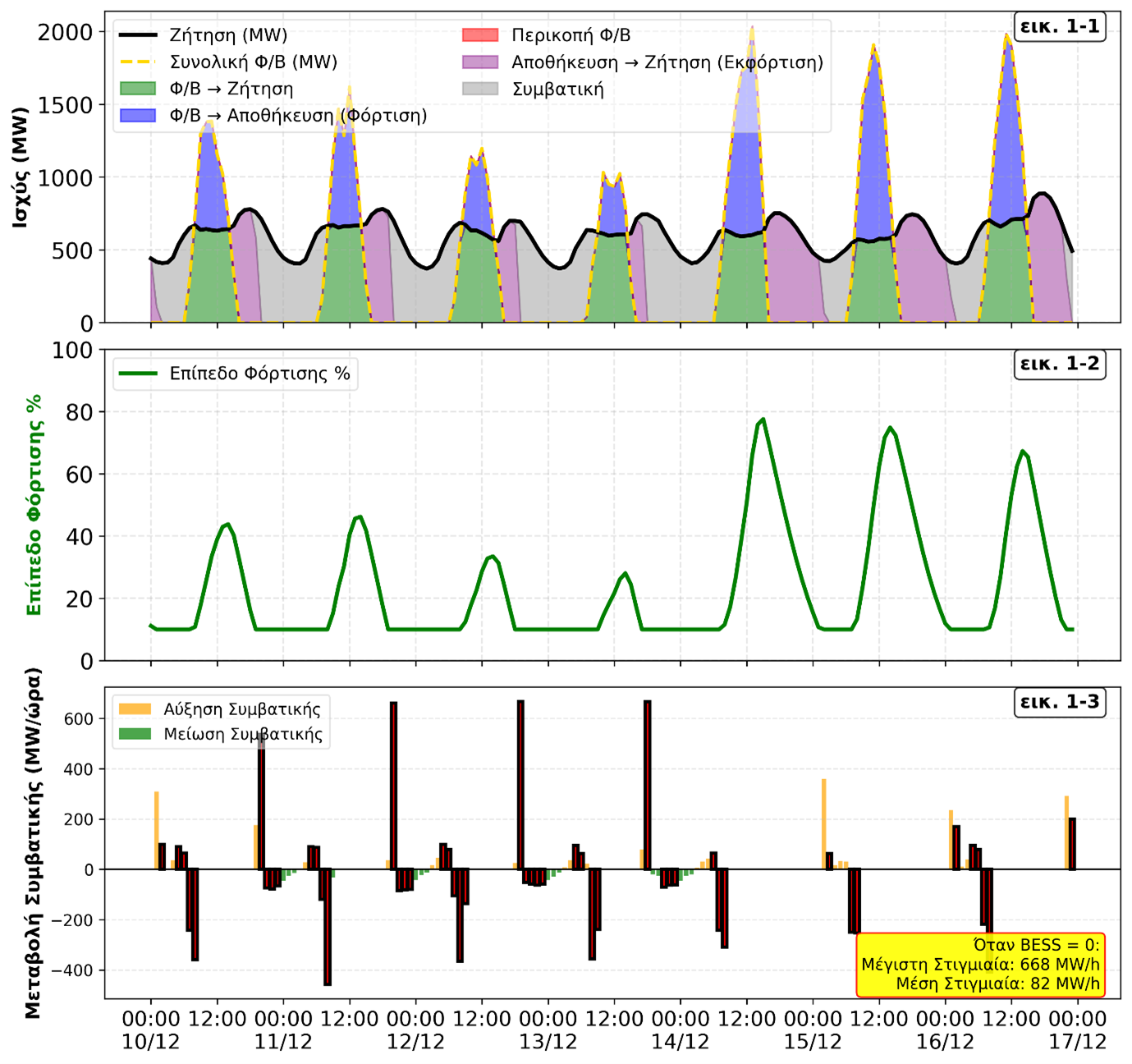 Κατά την εβδομάδα μέγιστης ζήτησης του καλοκαιριού, η αιχμή φορτίου φθάνει περίπου τα 1.230 MW. Μετά τη δύση του ηλίου, το υπολειμματικό φορτίο προσεγγίζει τα 750 MW, ενώ εμφανίζονται απότομες μεταβάσεις (ramps) της τάξης των 680–700 MW. Αυτά τα μεγέθη είναι που καθορίζουν τη λειτουργική επάρκεια ενός απομονωμένου συστήματος. Την ικανότητά του να ακολουθεί γρήγορα τη μεταβολή του καθαρού φορτίου, να διατηρεί τάση και συχνότητα εντός ορίων και να ανταποκρίνεται σε διαταραχές. Η εικόνα 1, ωστόσο, αποτυπώνει μια διαφορετική αλλά εξίσου κρίσιμη δοκιμασία όπου την εβδομάδα με τη χαμηλότερη παραγωγή φωτοβολταϊκών (Δεκέμβριος), όπου η αποθήκευση δεν καταφέρνει να γεμίσει πλήρως και η συμβατική παραγωγή καλείται να καλύψει τόσο απότομες μεταβάσεις όσο και ένα πολύ μεγάλο μέρος της ζήτησης. Κατά συνέπεια, δεν αρκεί η αναφορά σε ετήσια ενεργειακά ισοζύγια ή σε ποσοστά κάλυψης MWh απαιτείται αξιολόγηση με όρους ισχύος (MW), ρυθμών μεταβολής (MW/h), εφεδρειών και αξιοπιστίας.
